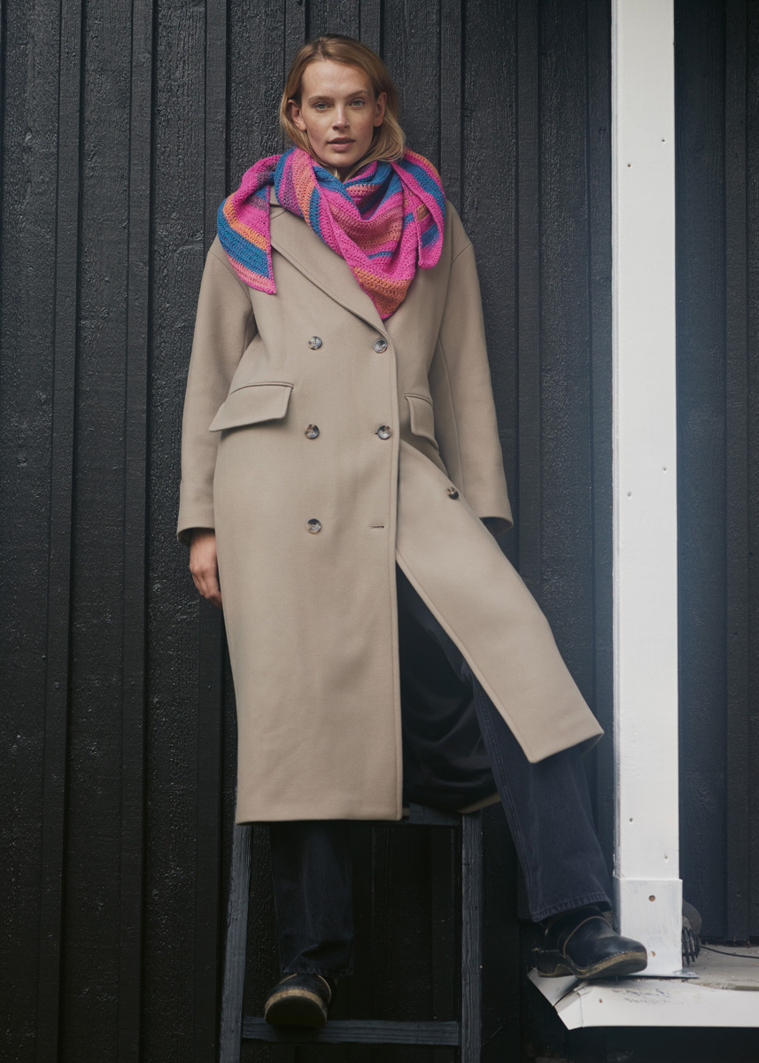 Lana Grossa-Qualität „Gomitolo Tosca“ (60 % Schurwolle, 40 % Polyacryl, LL = ca 700 m/200 g): 200 g Dunkelpetrol/Pink/Rotviolett/Brombeer/Goldgelb (Fb 165); Häkelnadel Nr 4,5.