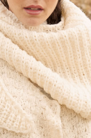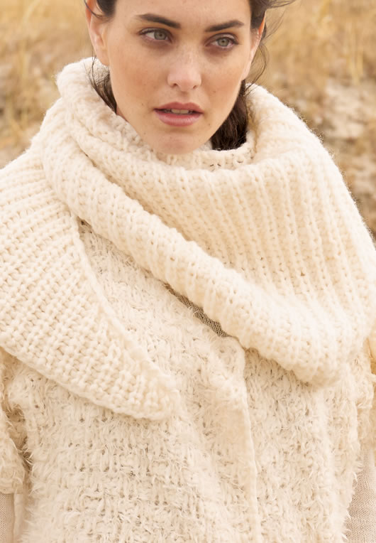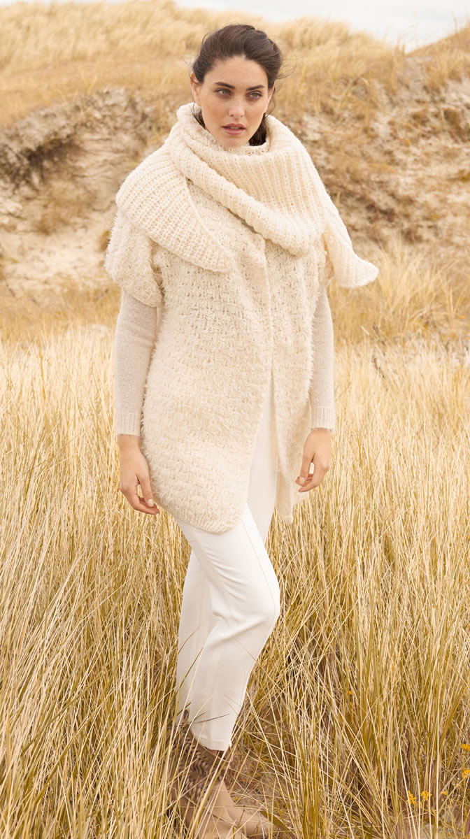 NICHTS FÜHLT SICH AN KÜHLEN TAGEN angenehmer und kuscheliger an als Strick! Wohlfühlmomente schenkt uns diese verschlusslose Jacke inklusive dem lässigen Tuch, das sich wärmend um unsere Schultern legt. So überstehen wir strengste Winter genial gewärmt wie gestylt.
