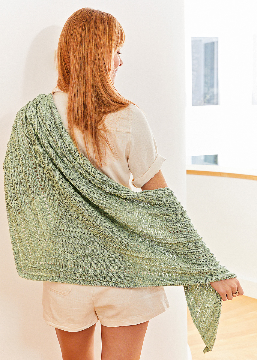 Lana Grossa-Qualität „Landlust Sommerseide“ (50% Seide, 50% Baumwolle, LL ca. 170 m/50 g), 250 g in Lindgrün (Fb 40); 1 Rundstricknadel Nr. 4,5, 120 cm lang.