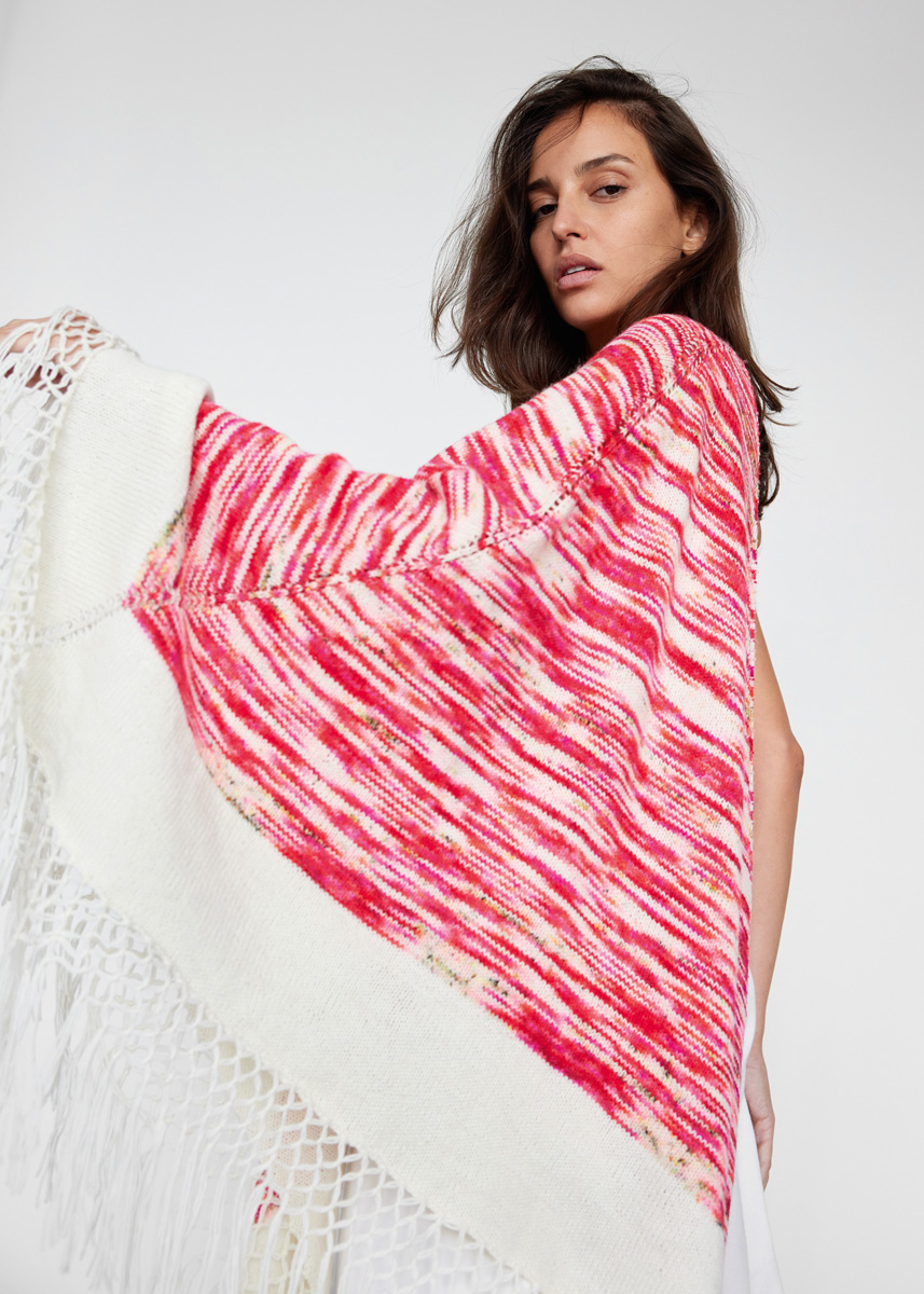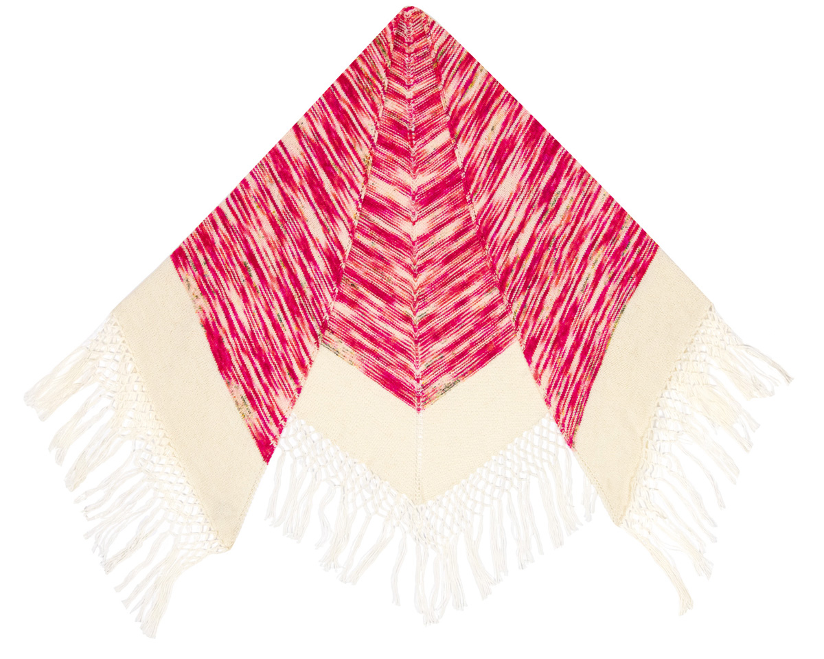 Raffiniert gefärbtes Garn beschert diesem Dreieckstuch einen exotischen Ikat-Flair. Die angeknüpften Fransen werden in Makramee-Manier kunstvoll verknotet.
