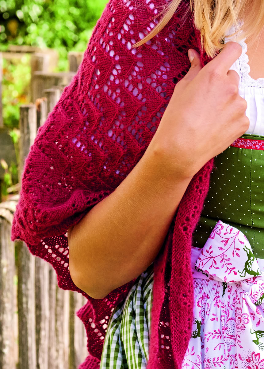 Dann kommt, je nachdem was wir vorhaben, die Weste mit der Zopfleiste im Rücken zum Einsatz. Oder das Schultertuch: mit dem feinen Ajourmuster, das macht bei eleganteren Anlässen schon was her. Beide sehen halt stylisch zum Dirndl aus!