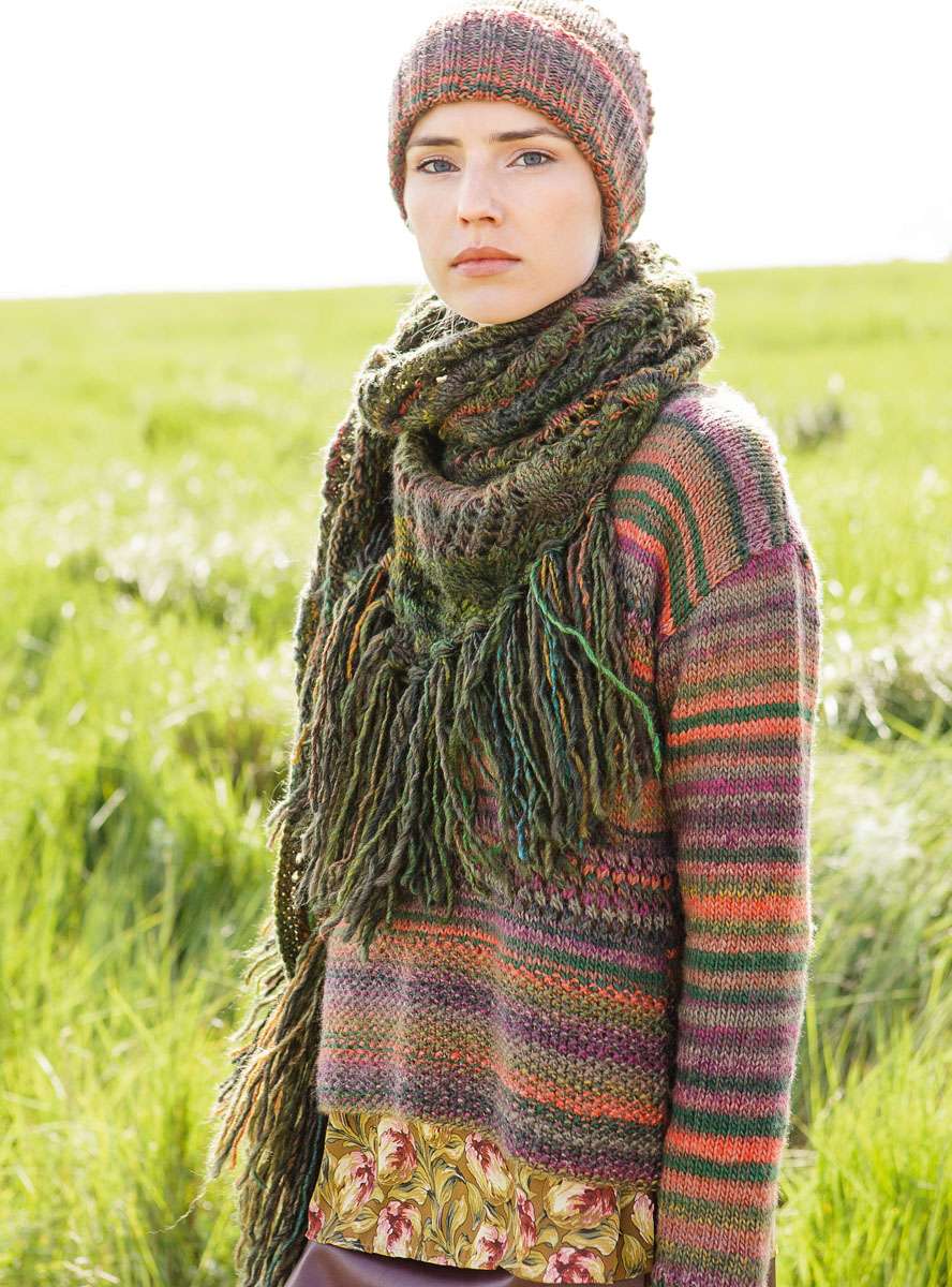 Lana Grossa-Qualität „Gomitolo 100“ (50 % Schurwolle, 50 % Polyacryl, LL = ca. 180 m/100 g), 500 g Moosgrün/Oliv/Orange/Kupfer (Fb 101). 1 lange Rundstrick-Nd Nr. 7; 1 Zopf-Nd; 1 Häkel-Nd Nr. 6.
