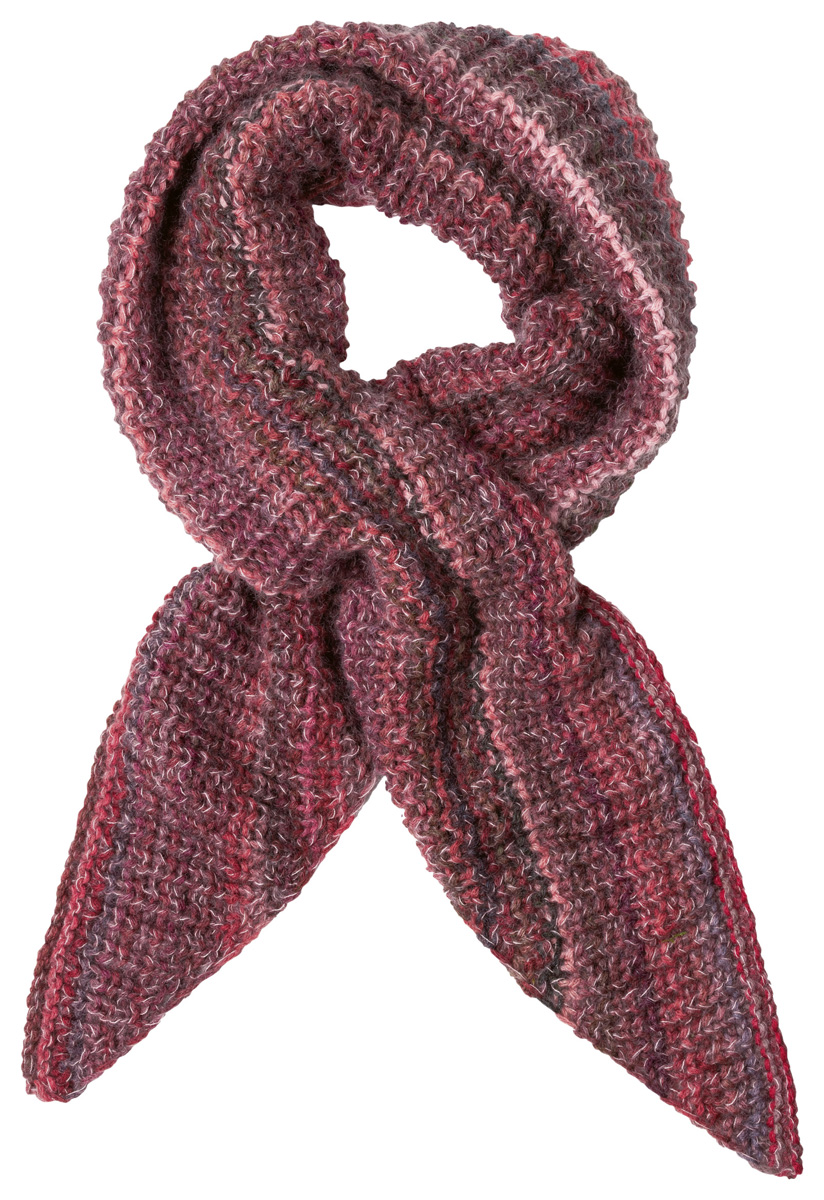 Lana Grossa Qualität „Pappagallo“ (90% Schurwolle (Merino extrafine), 10% Polyamid, LL= 250 m/100 g): 200 g Schwarz-/Dunkel- Tonrot/Moos-/Graugrün/Hellbeige/Koralle/ Oliv/Hellgrau/Altrosa/Camel/Schwarzbraun/Flieder (Fb. 10) und Lana Grossa Qualität „Silkhair“ (70% Mohair (Superkid), 30% Seide, LL= 210 m/25 g) 50 g Altrosa (Fb. 174), Stricknadel Nr. 9, je eine Rundstricknadel Nr. 9 mit Seillänge 80 und 120 cm.