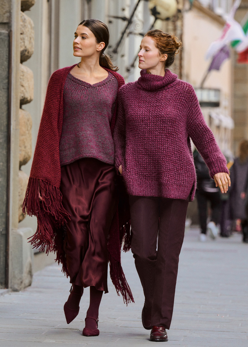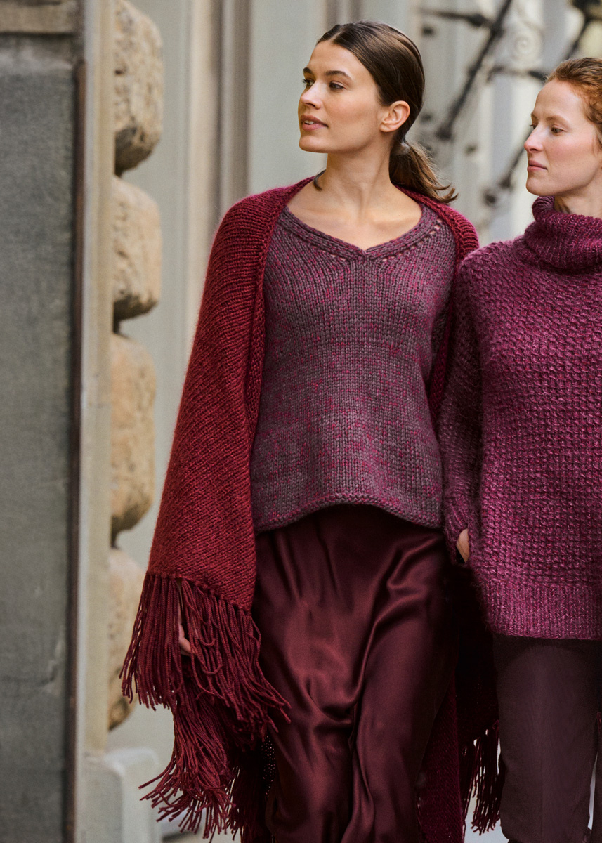Lana Grossa-Qualität „Silkhair“ (70 % Mohair (Superkid), 30 % Seide, LL = ca 210 m/25 g): ca 100 g Bordeaux (Fb 113); Lana Grossa-Qualität „Alta Moda Alpaca“ (90 % Alpaka (Baby), 5 % Schurwolle (Merino), 5 % Polyamid, LL = ca 140 m/50 g): ca 500 g Burgund (Fb 94); lange Rundstricknadel Nr 7 und 8; 1 Häkelnadel Nr 7.