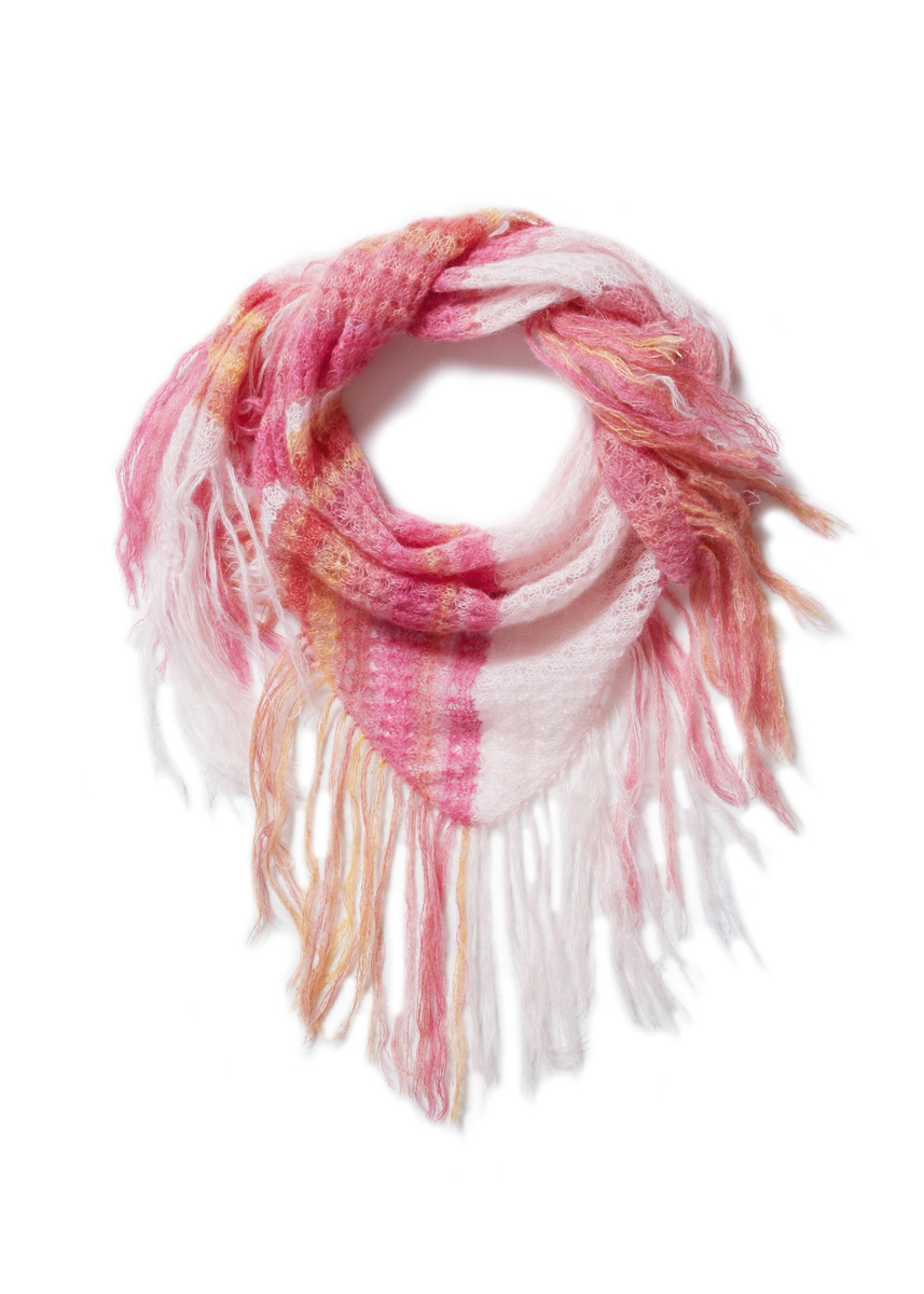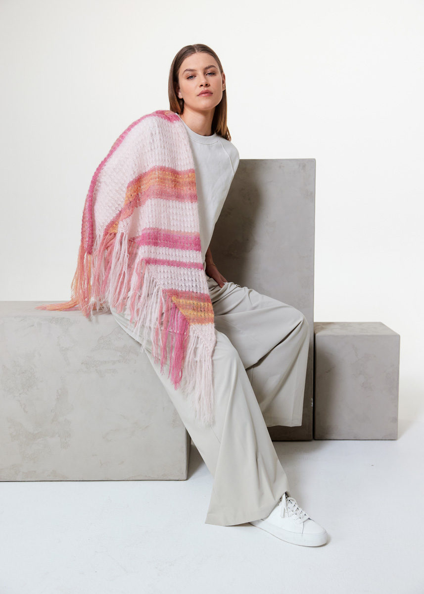 Lana Grossa Silkhair Print (70% Mohair (Superkid), 30% Seide, Lauflänge 210 m/25 g), 50 g Beere/Altrosa/Fuchsia/Himbeer/Goldgelb/Nougat (Fb. 428) und Lana Grossa Silkhair (70% Mohair (Superkid), 30% Seide, Lauflänge 210 m/25 g), 50 g Puderrosa (Fb. 86); 1 Rundstricknadel Nr. 4,5, 80 cm lang und 1 Häkelnadel Nr. 4 zum Einziehen der Fransen.