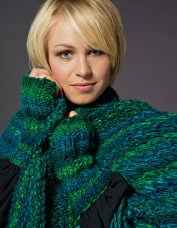 Lana Grossa Qualität „Olympia”, 53 % Schurwolle, 47 % Acryl, ca. 600 g Türkis/Petrol/Grasgrün/Tanne (Fb.4), Stricknadeln Nr. 10, 1 Stricknadelspiel Nr. 8.