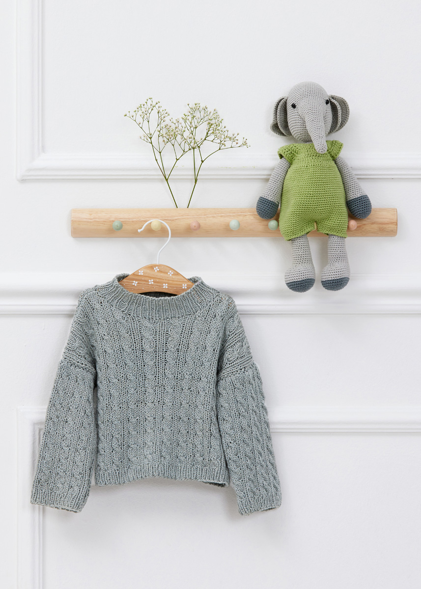 Lana Grossa-Qualität „Cotone“ (100 % Baumwolle; Lauflänge = 125 m/50 g): 150 g Hellgrau (Fb 27), 50 g Dunkelgrau (Fb 19) und 100 g Lindgrün (Fb 73); je eine Häkelnadel 3 mm und 3,5 mm; zwei Sicherheitsaugen mit 6 mm Ø; Holzperle mit 10 mm Ø in Grün; Füllwatte.
