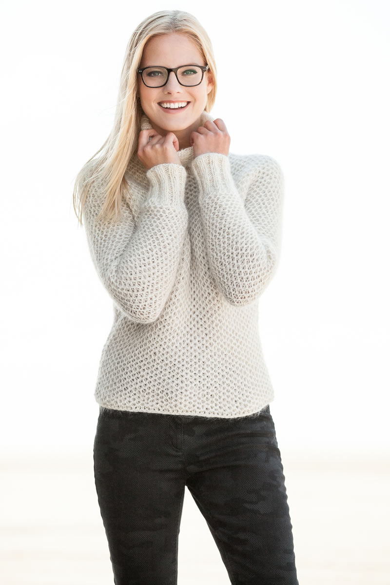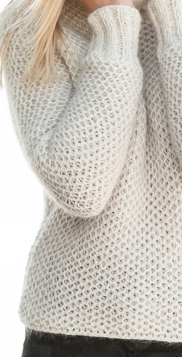 Gedämpftes Weiß, ein Hauch Lurex, dazu Netzpatentmuster und eine feminine Fledermaus-Form: Simple Chic in Bestform.