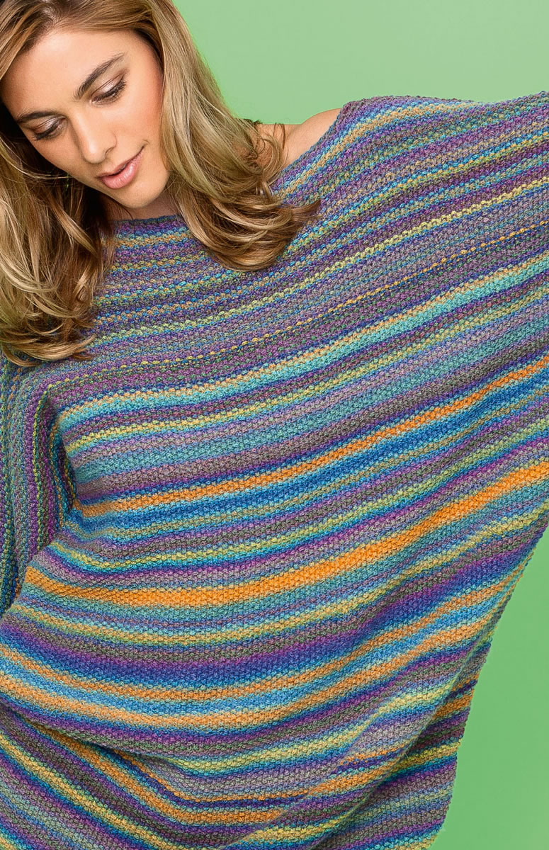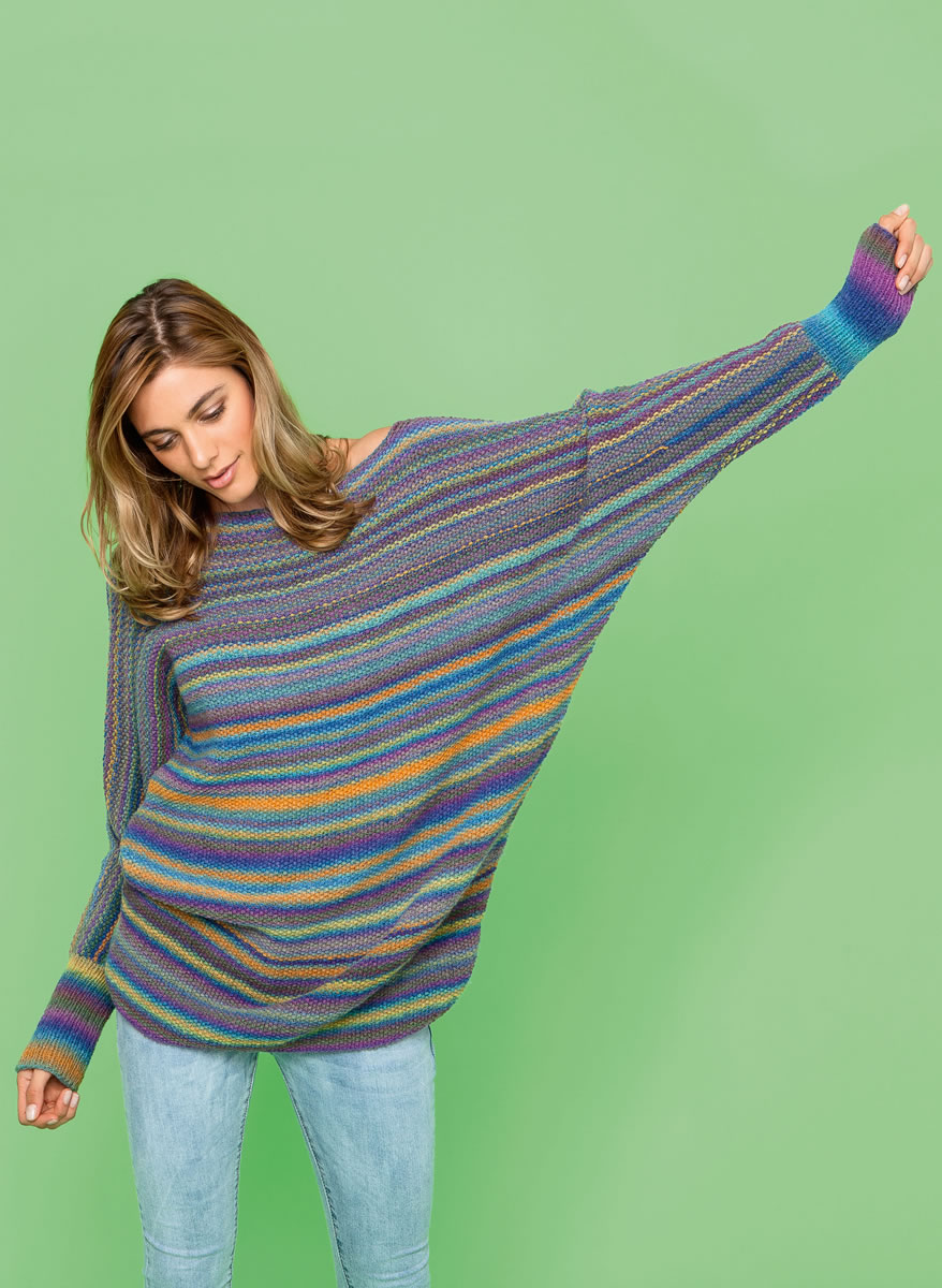 Lana Grossa-Qualität „Tinto“ (45 % Baby Alpaca, 40 % Schurwolle, 15 % Nylon,, LL = ca. 190 m/50 g), 550 (600) 650 g Senfgelb/Türkis/Blau-/Rotviolett/Resedagrün/Blau (Fb 2). Strick-Nd Nr 4 und 4,5, eine Häkel-Nd Nr 4.