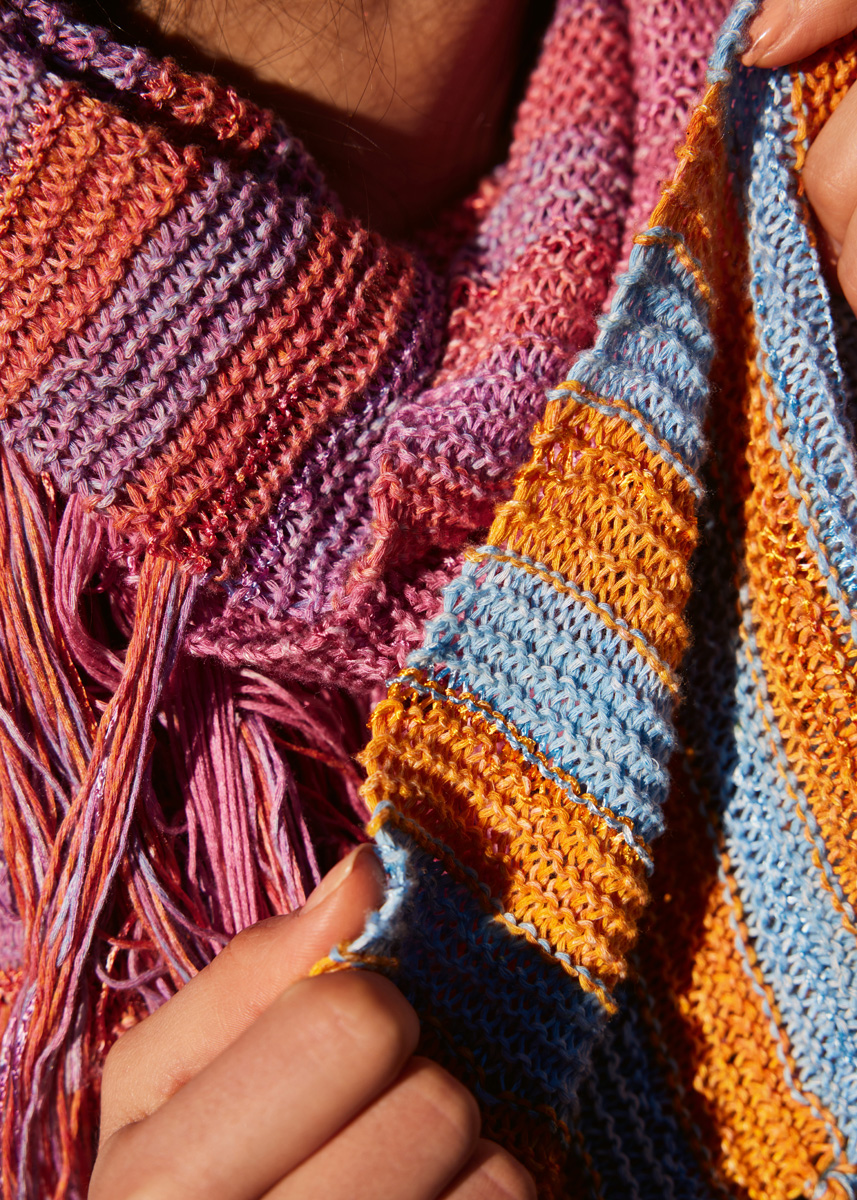 Lana Grossa-Qualität „Gomitolo Sole“ (58 % Viskose, 42 % Baumwolle, LL = ca. 760 m/200 g): ca. 400 g Gelb/Orange/ Flieder/Pink/Helltürkis/Hellgrün (Fb 918); Stricknadel Nr 4,5.