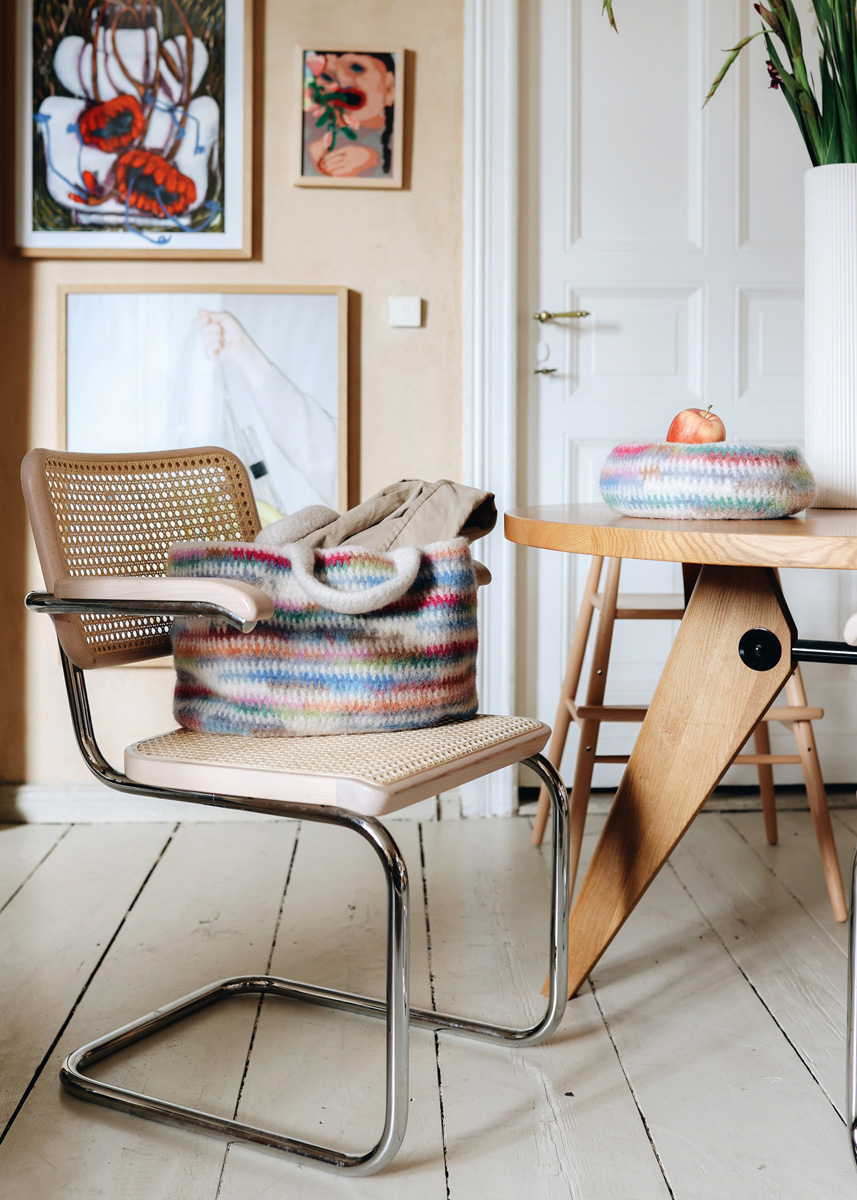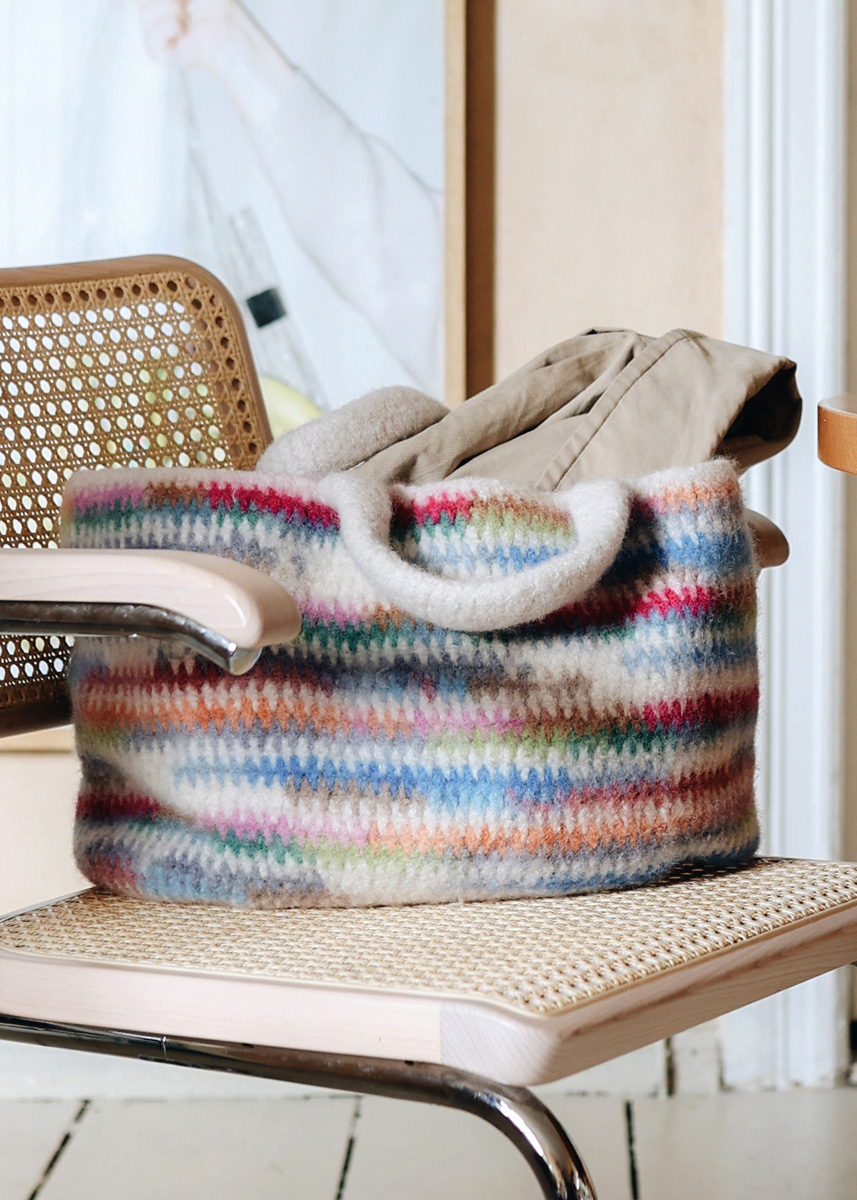 Natürliches Rohweiß und eine colorierte Qualität stecken in dem wunderschönen, gefilzten Shopper. Er wird aus einfachen Stäbchen gehäkelt. Die bauchige Obstschale besteht aus Rohweiß und den Resten des bunten Garns der Tasche.