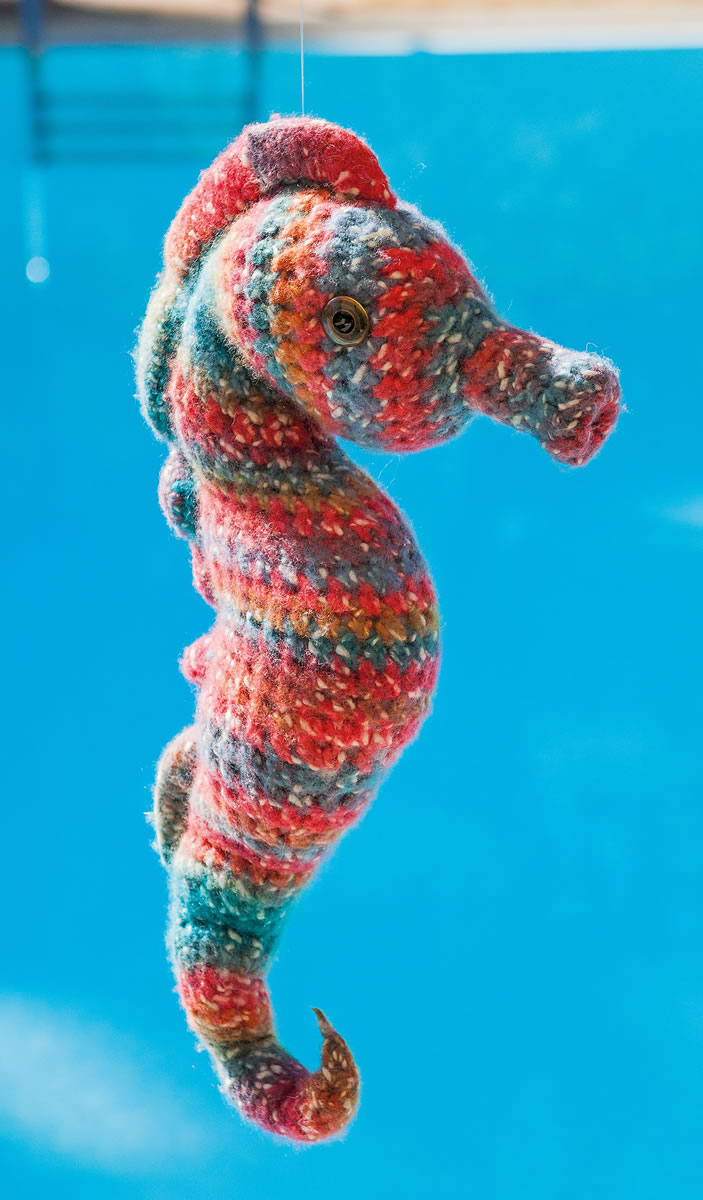 Lana Grossa-Qualität „Lei Norvegia” (100 % Schurwolle (Merino), LL = ca. 40 m/50 g): ca. 200 g Natur/Senf/Weinrot/ Petrol (fb. 706); 2 Tieraugen von Union Knopf, Art. 45462, 23 mm Ø, in Fb. 16 hellbraun; 1 Wollhäkelnadel Nr. 8; Füllwatte.