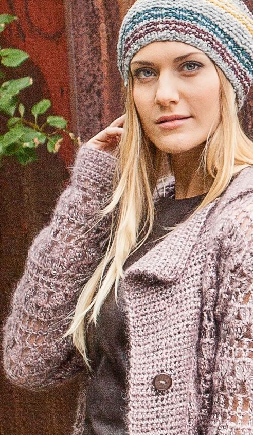 Lana Grossa „Silkhair” (70% Mohair Superkid, 30% Seide, LL = 210m/25 g) je 150 g Taupe (Fb 35) und Rosenholz (Fb 74), “Lace Lux” ( 67% Viskose, 33% Schurwolle, LL = 310 m/50 g) 200 g Taupe/Silber meliert (Fb 40). Häkelnadel Nr. 4,5 und 5 Knöpfe (Art. 451496, von Union Knopf).