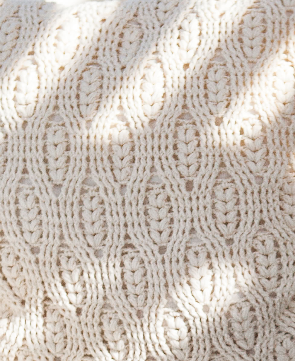 Lana Grossa-Qualität „Organico” (100 % (Bio) Baumwolle, LL = ca. 90 m/50 g): pro Kissen: ca. 650 g Ecru (fb. 6); 1 Wollhäkelnadel Nr. 4; 2 waschbare Kissenfüllungen, 60 x 60 cm.