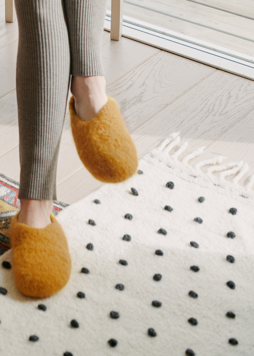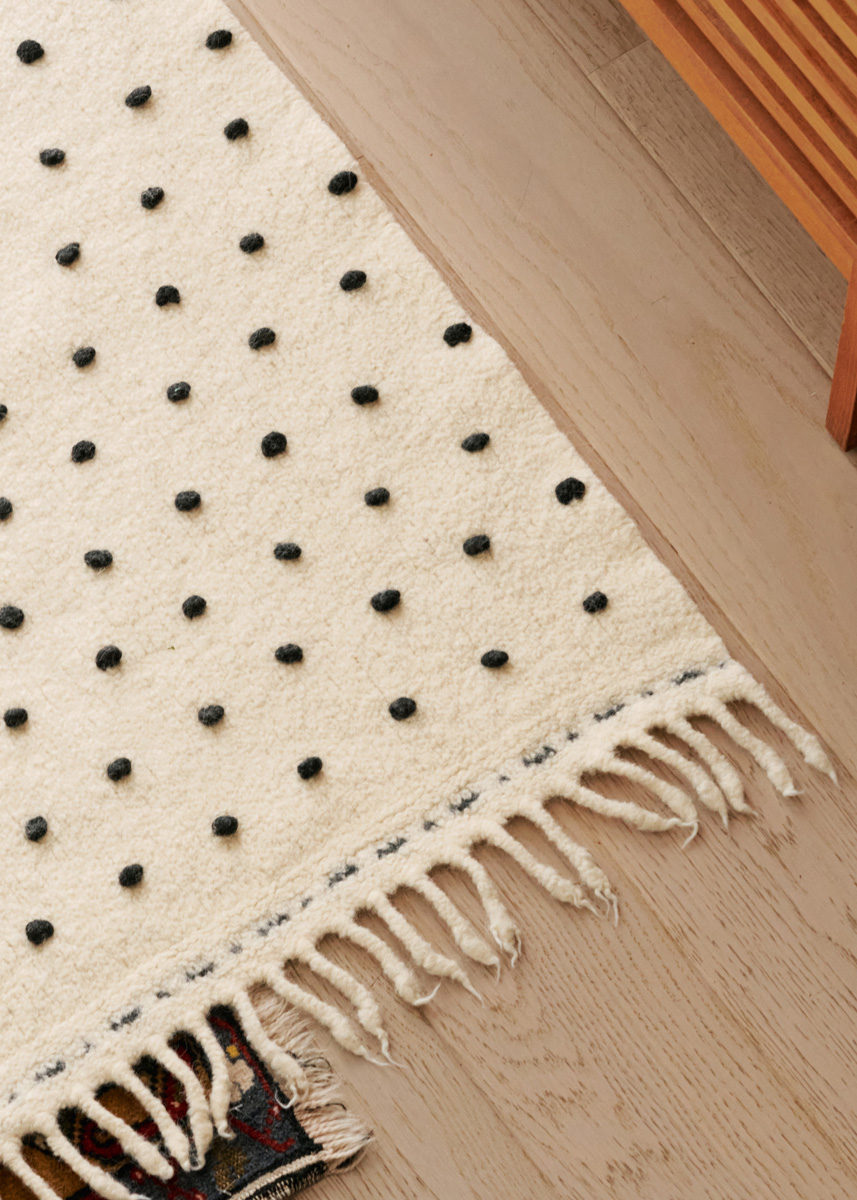 Beim kleinen, rohweißen Teppich sorgen anthrazitfarbene Noppen für einen modernen, leicht verspielten Look. Filzgarn, kraus gestrickte Blenden und geflochtene Fransen verleihen ihm eine lässige Berber-Optik.