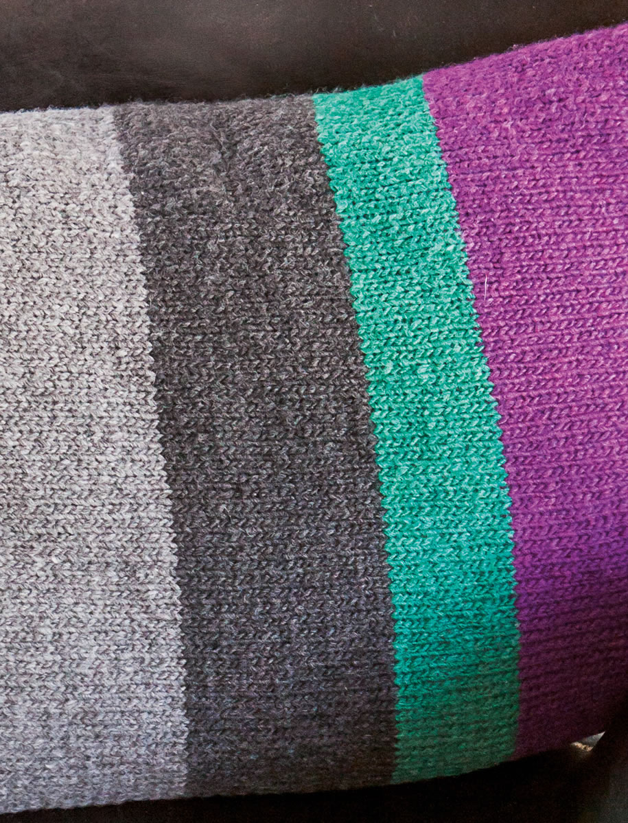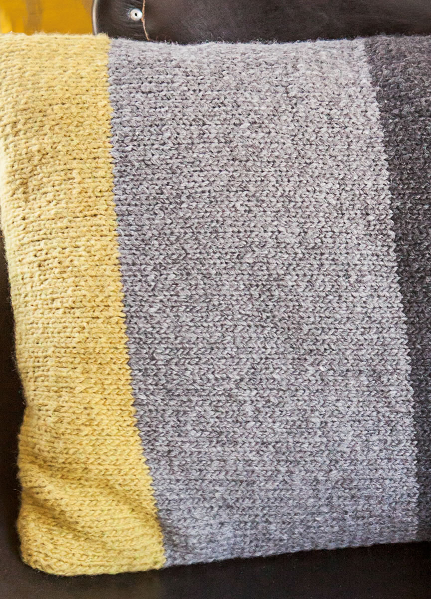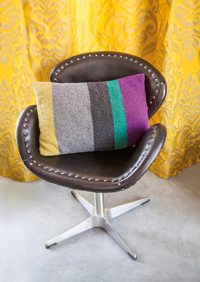 Macht müde Möbel munter: Das glatt rechts gestrickte Blockstreifen-Kissen in den schönsten Trendfarben der Stunde.