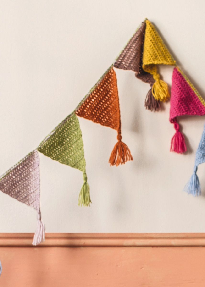 Lana Grossa-Qualität „Brigitte No. 2“ (47 % (Baby) Alpaka, 45 % Baumwolle, 8 % Schurwolle (Merino), LL = ca 140 m/50 g): Je 50 g Kiwi (Fb 39), Maisgelb (Fb 21), Pink (Fb 19), Hellblau (Fb 23), Altrosa (Fb 12), Terrakotta (Fb 42), Zimtorange (Fb 32); Häkelnadel Nr 5,5.