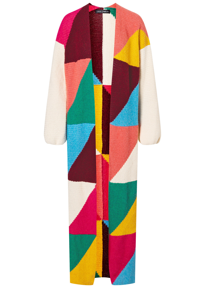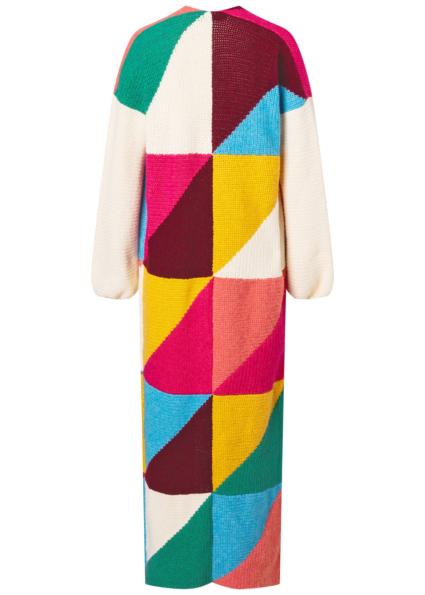 Bodenlange Mäntel sind Trend. Dieses verschlusslose Prachtexemplar besteht aus zweifarbigen Rechtecken und unifarbenen Ärmeln. Mit etwas Geduld schafft das jede/jeder.