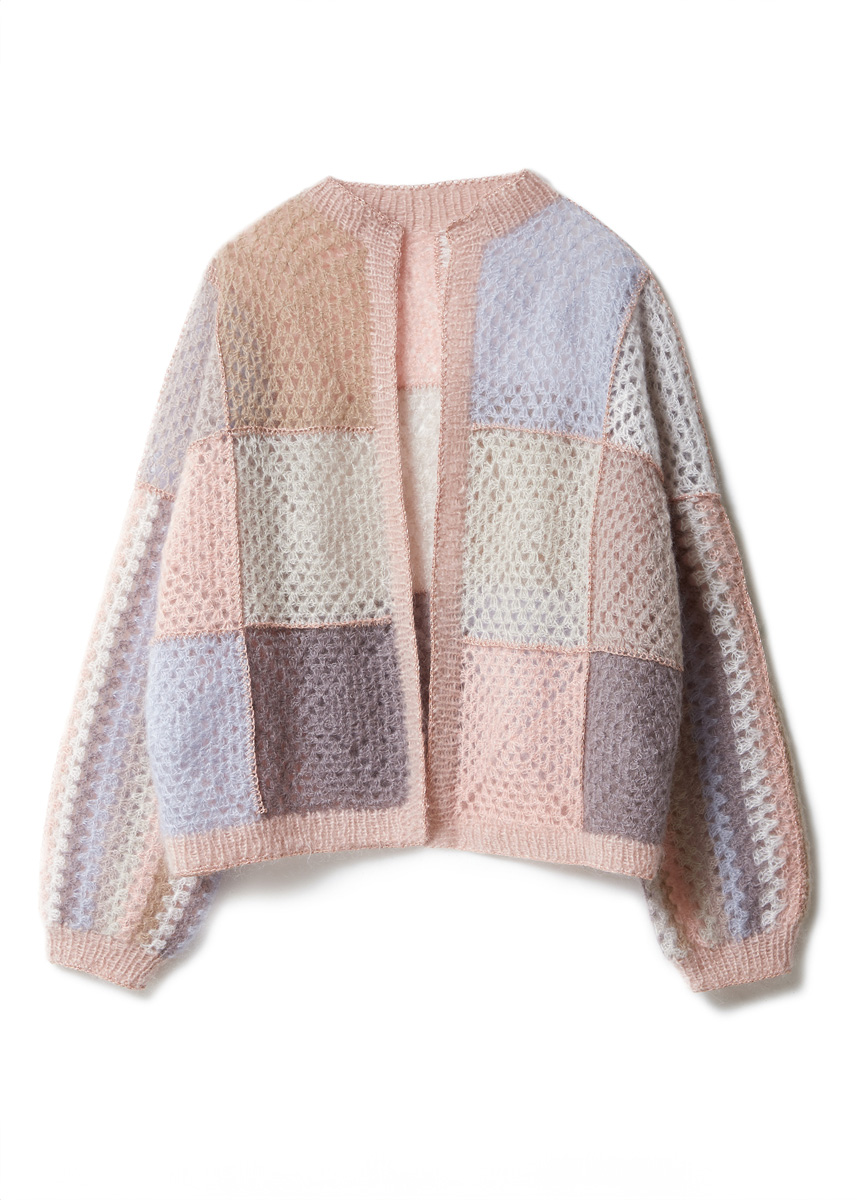 Lana Grossa Silkhair 70% Mohair (Superkid), 30% Seide; LL = 210m/25g: 75 (75) 75 (75) 100 g Apricot (Fb. 199), je 50 (50) 50 (50) 100 g Lichtgrau (Fb. 189) und Taupe (Fb. 35) , je 25 (25) 50 (50) 50 g Hellbeige (Fb. 18), Weiß (Fb. 117) und Perlbeige (Fb. 123) und Lana Grossa Setasuri 69% Alpaka (Suri), 31% Seide; LL = 212/25 m: 25 (25) 25 (25) 25 g Perlbeige (Fb. 36) und Lana Grossa Brillino 83% Viskose, 17% Metallische Faser: LL = 212/25 m : 25 (25) 25 (25) 25 g Altrosa/Gold (Fb. 19); Häkelnadel 4 - 4,5 mm, eine Rundstricknadel 4 mm, 60 - 80 cm lang, ein Nadelspiel 4 mm (entfällt, wenn mit der Magic-Loop-Methode gearbeitet wird), Clips zum Zusammenklippen der Grannys.