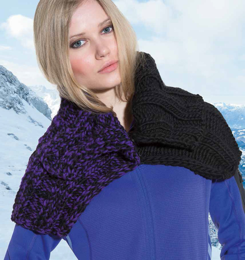 Lana Grossa-Qualität Lei (100 % Schurwolle (Merino), Lauflänge ca. 40 m/50 g): ca. 150 g Schwarz (Fb. 7) und Lana Grossa-Qualität Lei Bicolor (100 % Schurwolle (Merino), Lauflänge ca. 40 m/50 g): ca. 150 g Schwarz/ Rot (Fb. 603) 1 Rundstricknadel Nr. 12, 80 cm lang; 2 Druckknöpfe von Union Knopf, Art. 19630, 25 mm Ø, Fb. 9048 neonrot.