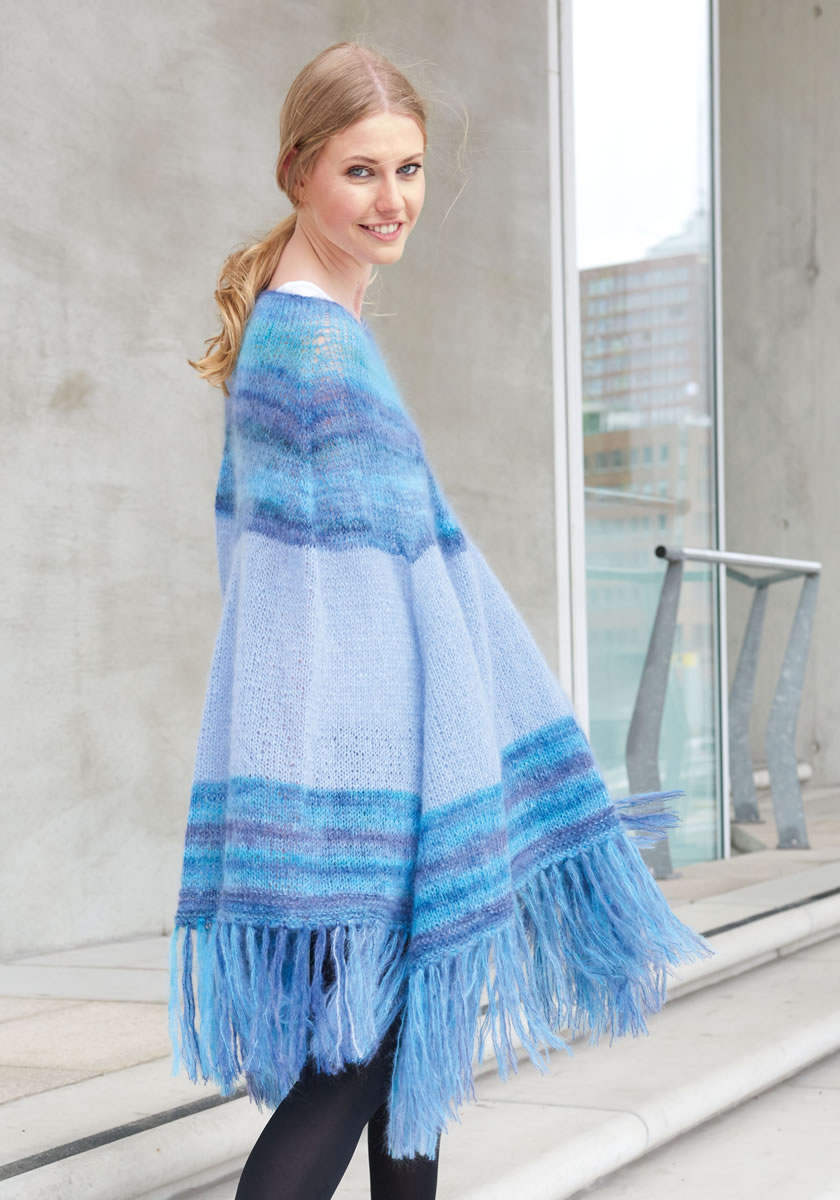 Lana Grossa Silkhair (70% Mohair, 30% Seide, LL 210 m/25 g) in Himmelblau (Fb 92), 125g und Lana Grossa Silkhair Print (70% Mohair, 30% Seide, LL 400 m/50 g) in Türkisblau meliert (Fb 344), 300g, Rundstricknadel Nr 4,5 mm und 8,0 mm, jeweils 60 cm, 80 cm und 100 cm, Häkelnadel 6,0 mm.