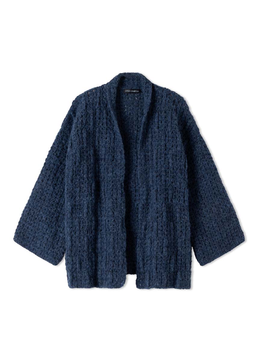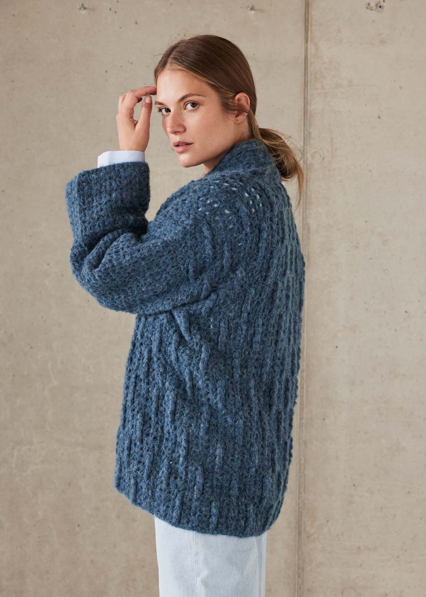 Der gehäkelte CARDIGAN besteht aus Alpaca Air II, einem voluminösem Netzgarn. Die Jacke beeindruckt mit markanten Strukturen und einem schmeichelnden Schalkragen.