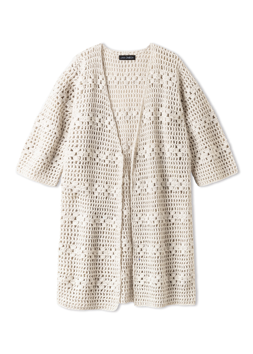 Lana Grossa-Qualität „Summer Softness“ (80 % Baumwolle (Bio), 20 % Schurwolle (Merino superfine), LL = ca 130 m/50 g): ca 550 (600 - 650) g Kalkweiß (Fb 26); Häkelnadel Nr 4,5.