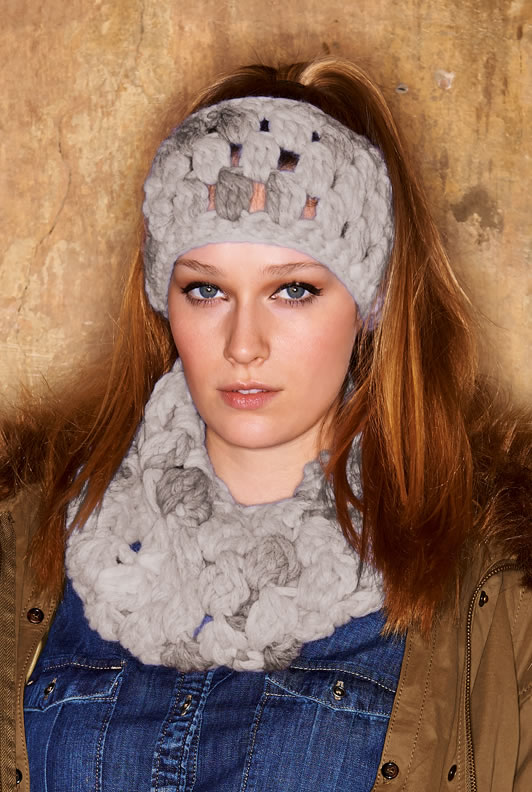 Lana Grossa-Qualität „Amici Due“ (51 % Schurwolle, 49 % Polyacryl, Lauflänge ca. 60 m/50 g): ca. 50 g Silbergrau/Grège/Weiß (Fb. 111); 1 Wollhäkelnadel Nr. 10