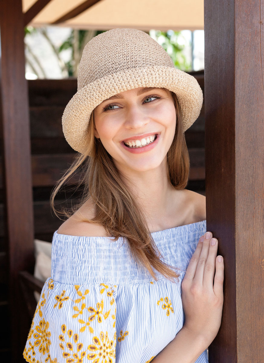 Niemals oben ohne: Der Häkel-Hut in Sand und Gold ist nicht nur ein schicker Sonnenschutz, er bringt auch jeden Look zum Strahlen. Und er ist locker an einem Ferientag im Liegestuhl fertig.