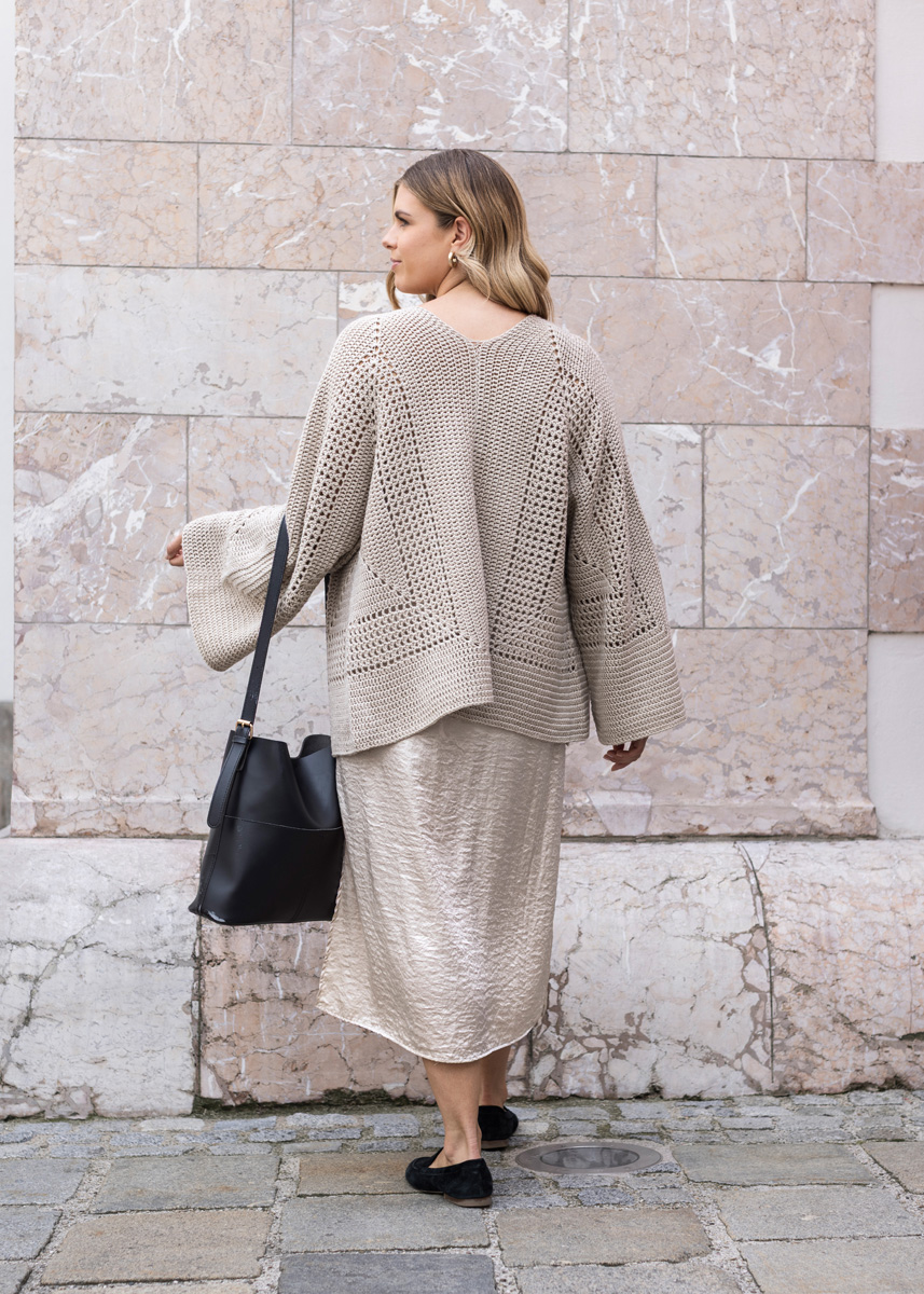 Die Jacke besteht aus zwei Sechsecken, die jeweils ausgehend vom Unterarm in Runden gehäkelt werden. Das Modell hat eine Länge von 58 (62 - 67) cm und eine Brustmehrweite von 36-28 cm bei 80-88 cm Brustumfang (36-28 cm bei 96- 104 cm Brustumfang - 36-24 cm bei 116-128 cm Brustumfang).