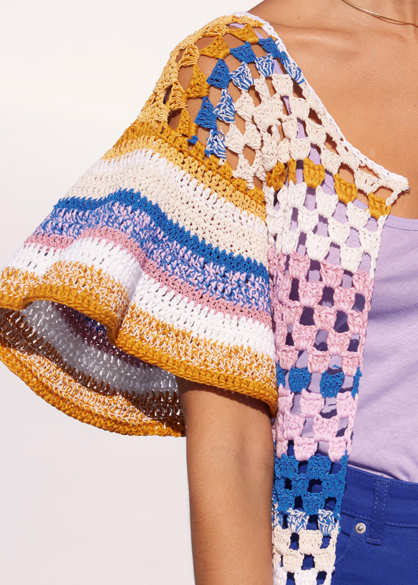 Lana Grossa-Qualität „Nastrino” (100 % Baumwolle, LL = ca. 190 m/50 g): je 100 g in Weiß (Fb. 1), Rosa (Fb. 6) und Ginstergelb (Fb. 11) und Lana Grossa-Qualität „Capri” (55 % Baumwolle, 30 % Polyamid, 15 % Seide, LL = ca. 150 m/50 g): je 100 g in Hellelfenbein (Fb. 38), Altrosa (Fb. 40), Maisgelb (Fb. 42) und Tintenblau (Fb. 46); 1 Häkelnadel Nr. 4,5; 1 Haken- und 1 Augenverschluss.