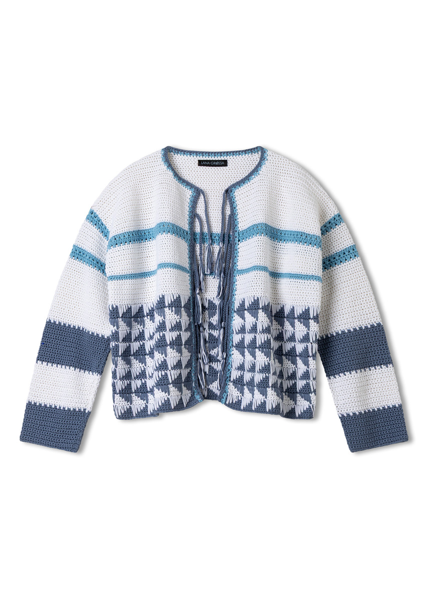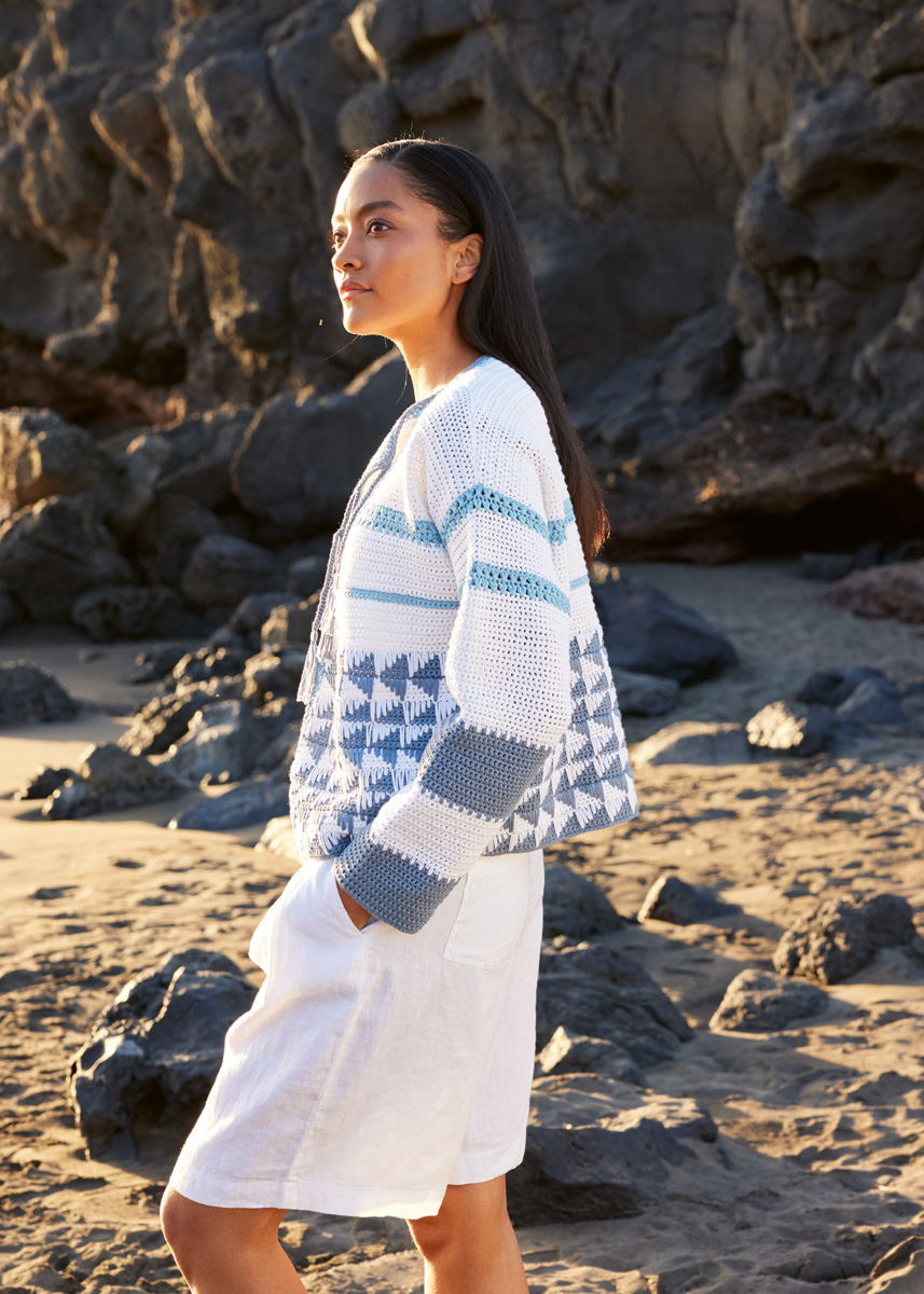 Feste Maschen und tief gestochene feste Maschen häkeln, mehr musst du fast nicht tun, um die – molto espressivo! – verschlusslose JACKE zu machen. Jetzt bleibt nur noch, die dekorativen Bändchen zu flechten und sich, da war doch noch was, unser neues Kreppgarn zu sichern.