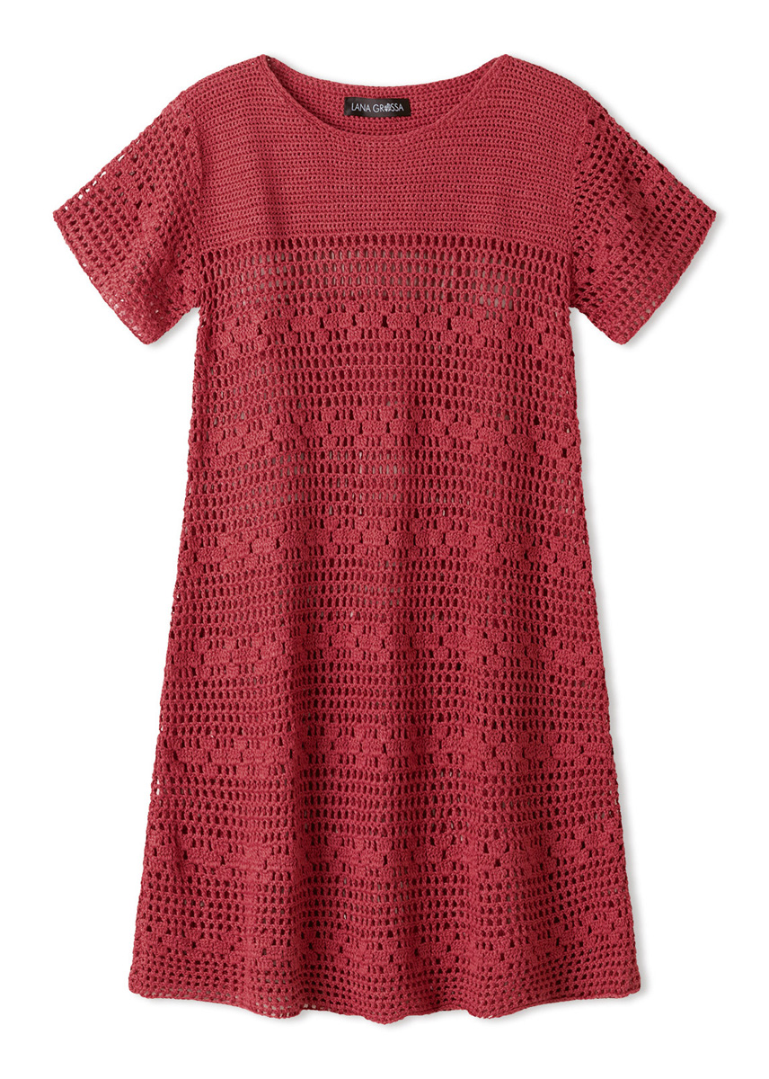 Lana Grossa-Qualität „Summer Cashmere“ (90 % Baumwolle, 10 % Kaschmir, LL = ca 210 m/50 g): ca 350 (400 - 450 - 500) g Orientrot (Fb 25); Häkelnadel Nr 3 und Nr 3,5.