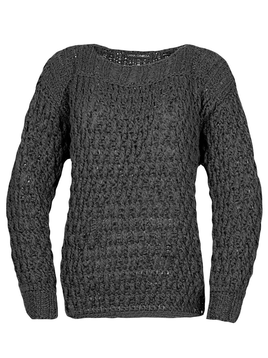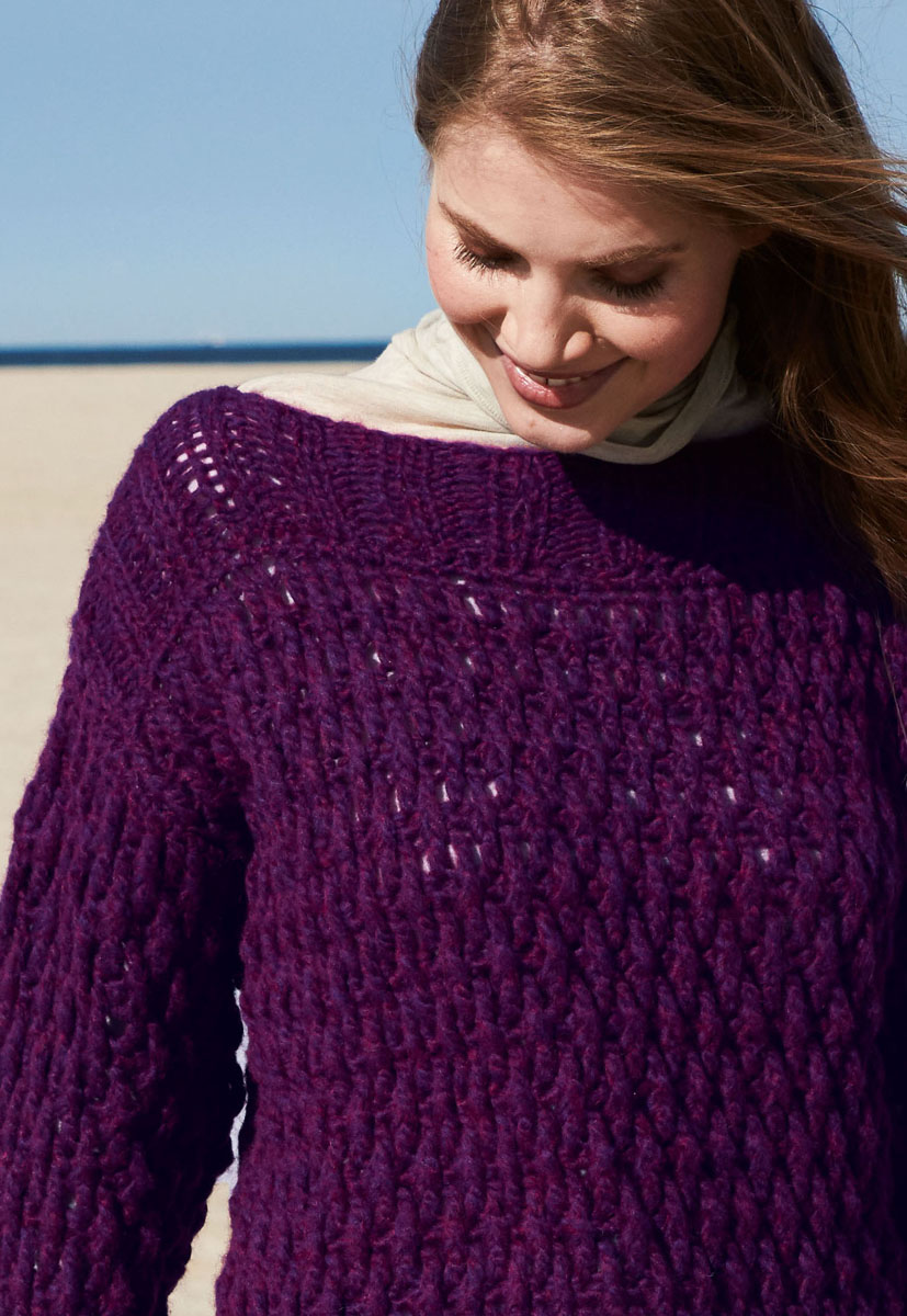 Lana Grossa-Qualität „Cool Air” (55 % Schurwolle (Merino), 33 % (Baby) Alpaka, 12 % Polyamid, LL = ca. 125 m/50 g): ca. 450 (500) g Rotviolett (Fb. 8); Stricknadeln Nr. 6,5, 1 Wollhäkelnadel Nr. 8.
