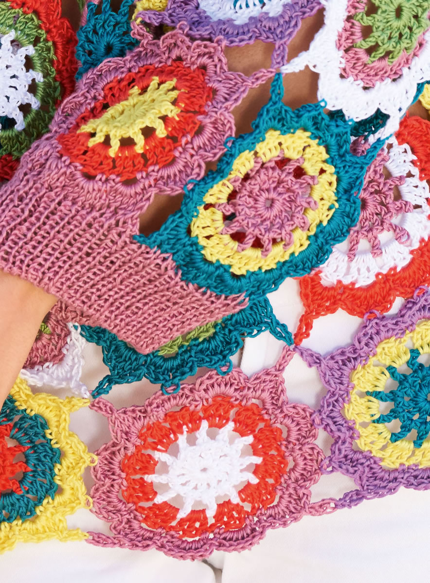 Lana Grossa-Qualität „Classico” (100 % Baumwolle, (gasiert, mercerisiert), LL = ca. 110 m/50 g): ca. 200 g Altrosa (Fb. 3), je ca. 150 g Petrolgrün (Fb. 39), Violett (Fb. 27) und Hellgrün (Fb. 48), je ca. 100 g Weiß (Fb. 18), Rot (Fb. 21) und Gelb (Fb. 12); 1 Wollhäkelnadel Nr. 4,5, 1 Rundstricknadel Nr. 4,5, 40 cm lang.