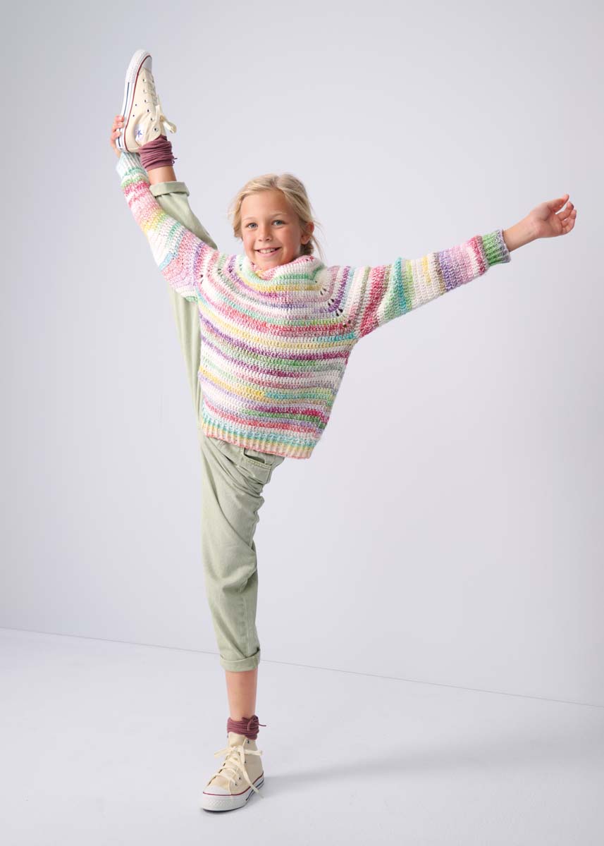 Der Pullover wird von oben nach unten in einem Stück mit doppeltem Faden gestrickt bzw. gehäkelt, je Qualität ein Faden.