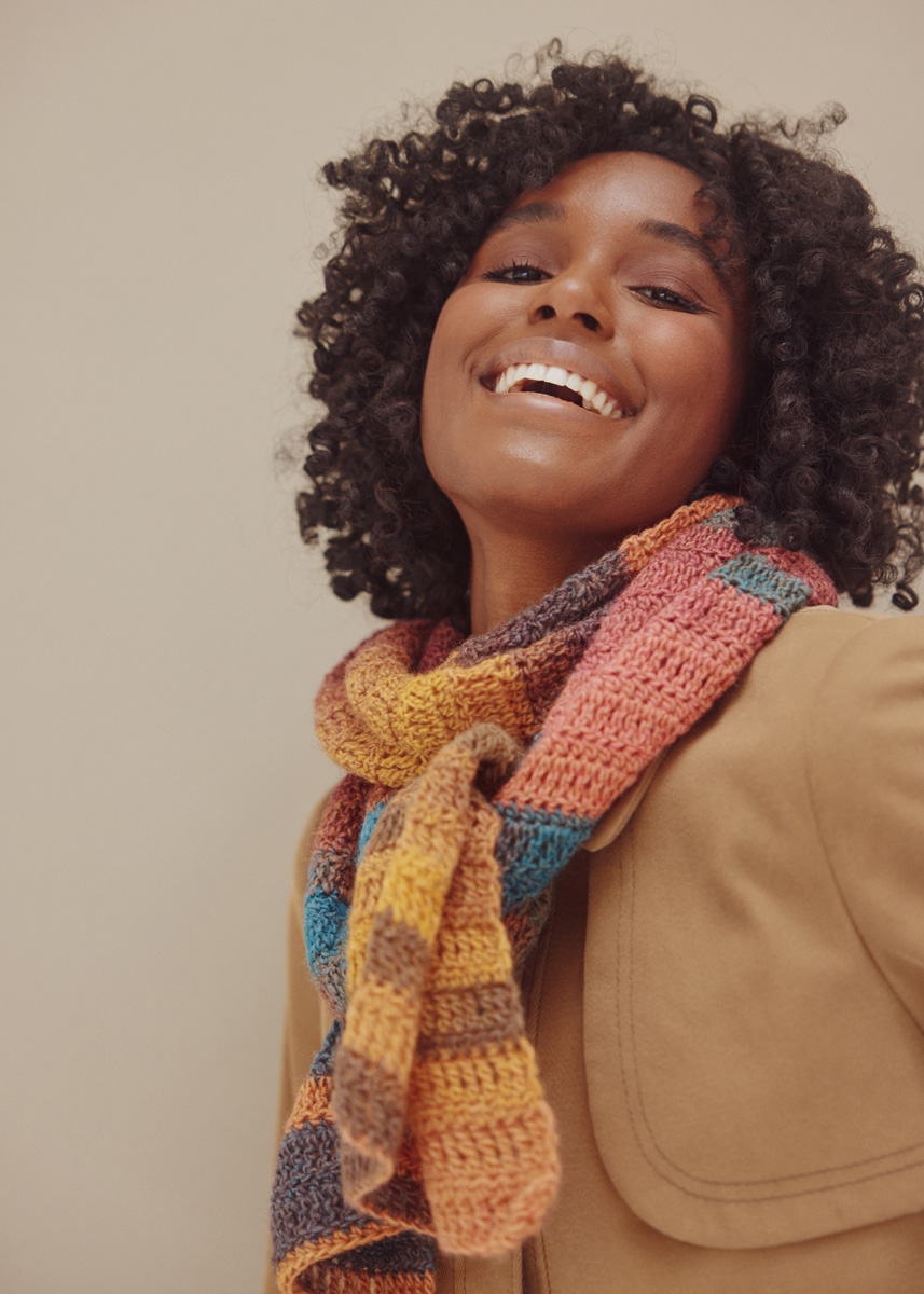 Lana Grossa-Qualität „Gomitolo Arte“ (60 % Schurwolle, 40 % Polyacryl, LL = ca 700 m/200 g): 1 Knäuel = ca 200 g Umbra/Camel/Beere/Hellrot/Petrol/ Dunkelgrau (Fb 1013); Häkelnadel Nr 4,5.