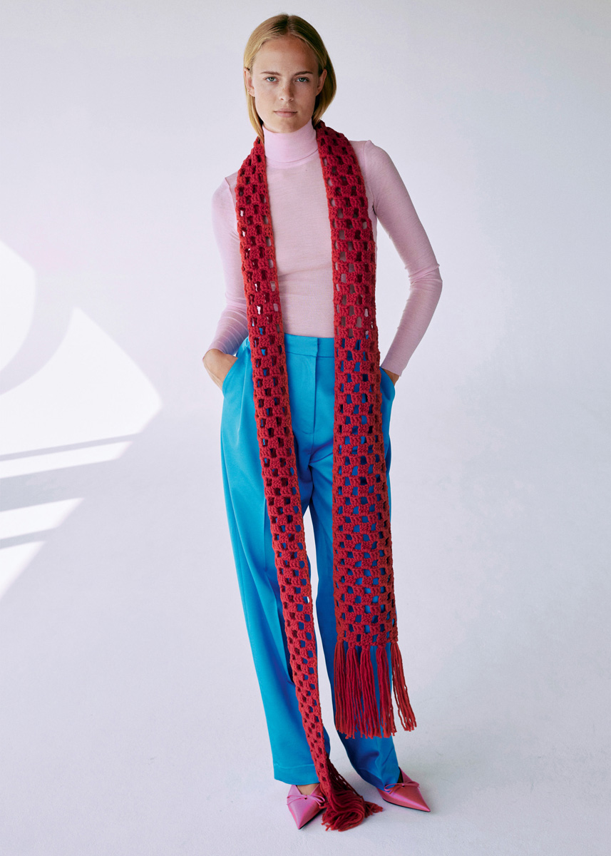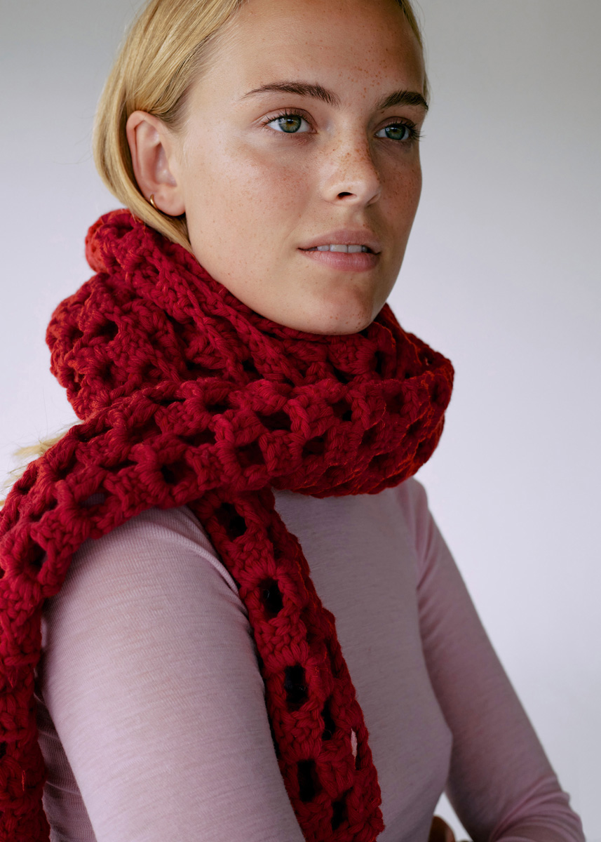 Lana Grossa-Qualität „Woohoo“ (100 % Schurwolle (Merino), LL = ca 250 m/200 g): ca 400 g Dunkelrot (Fb 5); Häkelnadel Nr 7.
