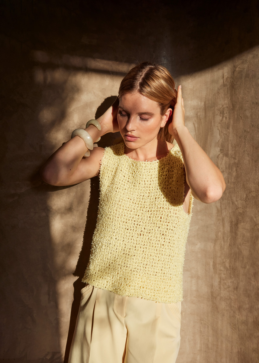 Gleiches Garn, gleiches Muster wie Modell 8 – und ebenso einfach zu häkeln ist das puristische Top, bei dem die Textur des Garns die Hauptrolle spielt. Eine gute Idee, die passende Jacke gleich mitzumachen!