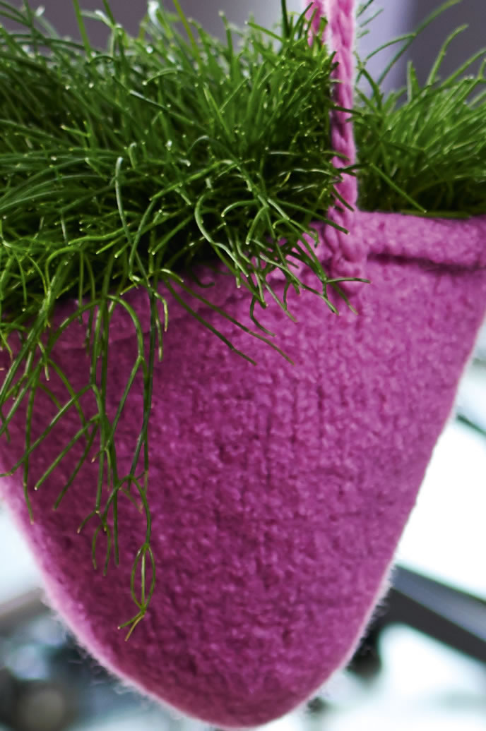 Lana Grossa Qualität „Feltro“ (100% Schurwolle, LL = 50 m/50 g), ca. 300 g Pink (Fb 52), 1 Spiel Stricknadeln Nr. 8 und 1 Rundstricknadel Nr. 8, 1 Häkelnadel Nr. 8, 1 Ring zum Aufhängen.