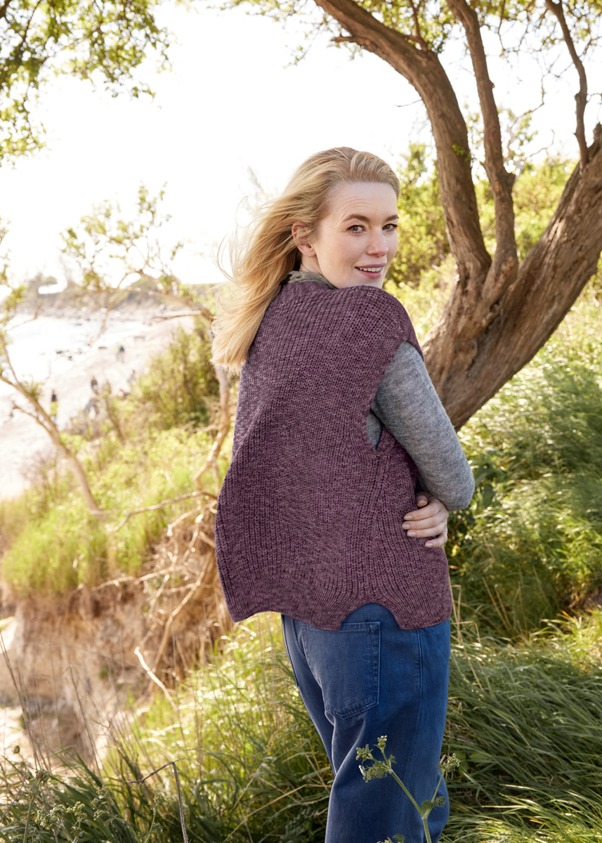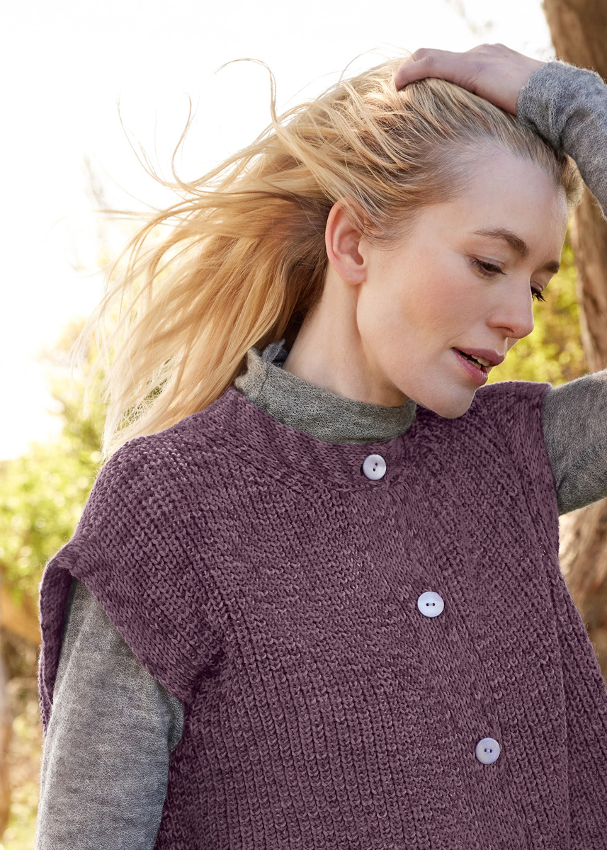 Lana Grossa Cool Wool Vintage (100 % Schurwolle (Merino), LL = ca 160 m/50 g), 500 (550 - 550 - 600) g in Antikviolett (Fb 7387). Stricknadeln Nr 3 und Nr 3,5. Fünf Knöpfe, ca 20 mm Ø.