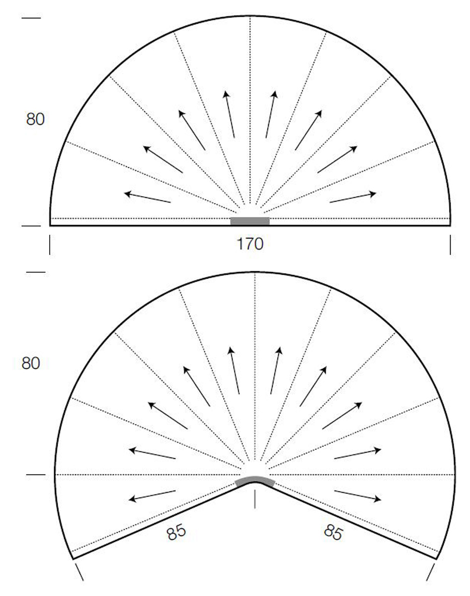 Das Originalmodell hat 10 Segmente und legt sich schön um Hals und Schultern. Ein Tuch mit 8 Segmenten bildet einen Halbkreis (siehe Schnitt).