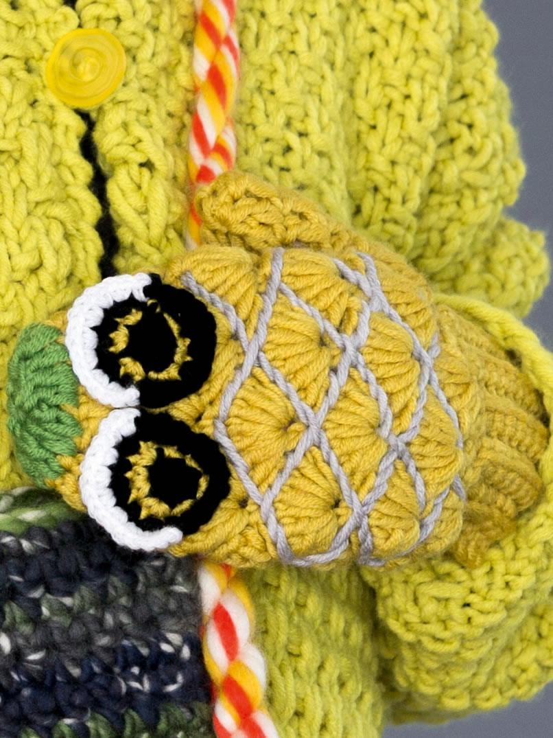 Lana Grossa Qualität „Bingo“ (100% Schurwolle, LL = 80 m/50 g), ca. 100 g Curry (Fb 127) und je ca. 50 g Apfelgrün (Fb 148), Schwarz (Fb 24), Weiß (Fb 23) und Hellgrau meliert (Fb 1), 1 Häkelnadel Nr. 4.