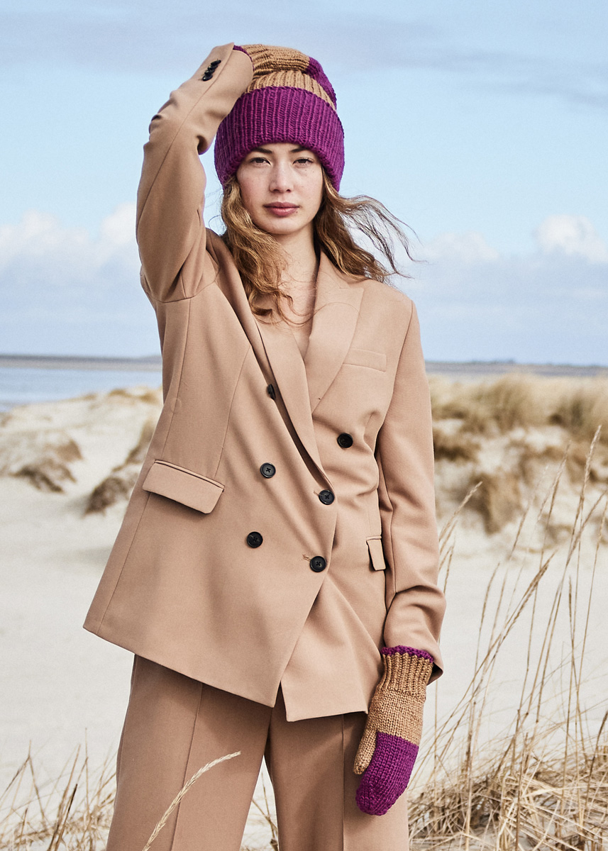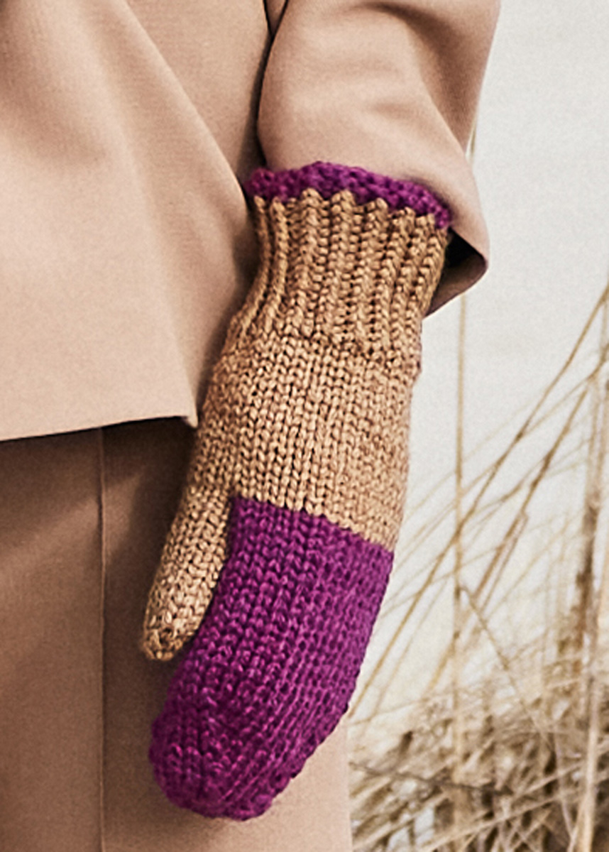 Lana Grossa-Qualität „Cool Merino“ (90 % Schurwolle (Merino), 10 % Polyamid, LL = ca 150 m/50 g): ca 50 g Fuchsia (Fb 2) + ca 50 g Camel (Fb 11); Nadelspiel Nr 4.