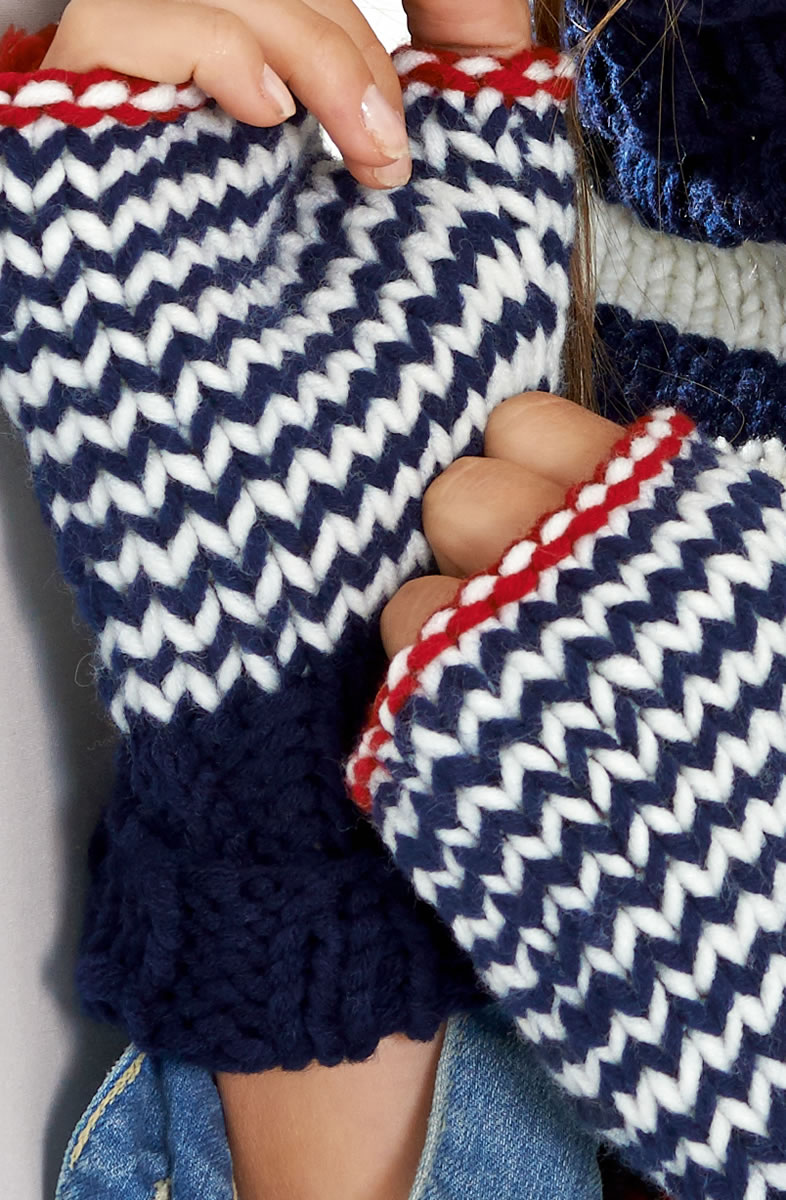 Lana Grossa-Qualität „Mille II“ (50 % Schurwolle (Merino extrafine), 50 % Polyacryl, waschmaschinenfest, LL ca. 55 m/50 g): je ca. 50 g Nachtblau (Fb. 12), Rohweiß (Fb. 17) und Weinrot (Fb. 9); Spielstricknadeln Nr. 6,5 und 7.