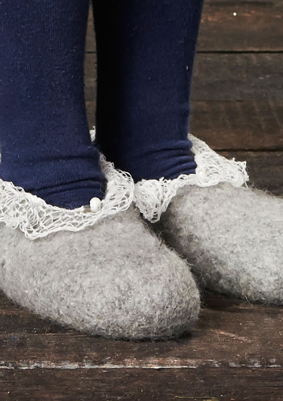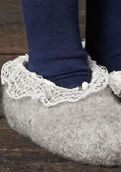 Lana Grossa Qualität „Feltro“ (100% Schurwolle, LL = 50 m/50 g), ca. 100 g Grau meliert (Fb 3), 1 Spiel Stricknadeln Nr. 8, ca. 60 - 80 cm weiße Spitze, 2 Perlmuttknöpfe von PRYM, Art. 317 112, 2 Perlen, Nähnadel und passendes Nähgarn.
