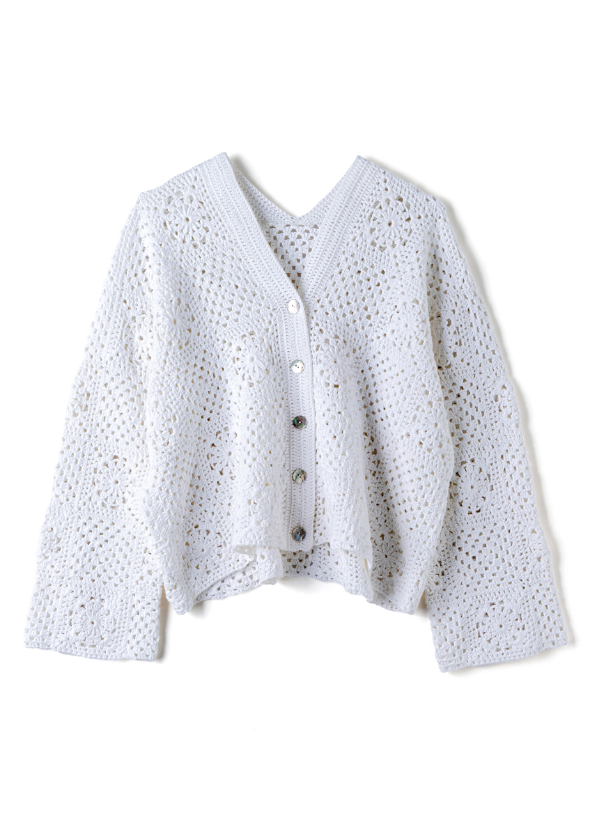 Lana Grossa-Qualität „Cotton Love” (100 % (Bio) Baumwolle, LL = ca. 170 m/50 g): ca. 600 g Weiß (Fb. 12); 1 Wollhäkelnadel Nr. 3; 5 Perlmuttknöpfe in Natur, ø 18 mm.