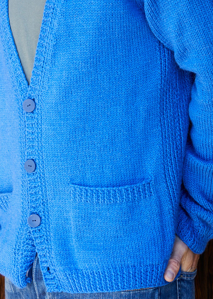 Lana Grossa-Qualität „Landlust Alpaka Merino 100“ (50% Baby Alpaka, 50% Schurwolle Merino filzfrei, LL ca. 100 m/50 g), 700 (750 - 800) g in Blau (Fb 317); Stricknadeln Nr. 4 und Nr. 4,5, 1 Rundstricknadel Nr. 4, 120 cm lang, 4 blaue Knöpfe, 20 mm Durchmesser.