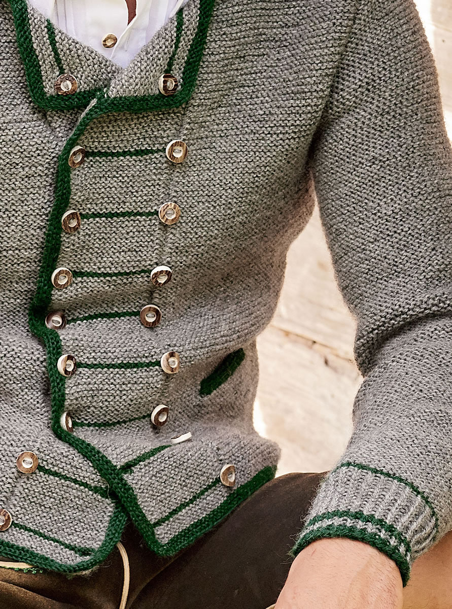 Lana Grossa-Qualität „Alpina” (80 % Schurwolle, 20 % Polyamid, waschmaschinenfest, LL = ca. 210 m/100 g): ca. 900 (900 – 1000) g Grau meliert (Fb. 5) und ca. 100 g Flaschengrün (Fb. 16); Stricknadeln Nr. 3, 1 Rundstricknadel Nr. 3, 60 cm lang, 2 Rundstricknadeln Nr. 3, je 120 cm lang; 18 Hornknöpfe von Union Knopf, Art. 25256, 16 mm ø, Fb. 22 braun/natur.