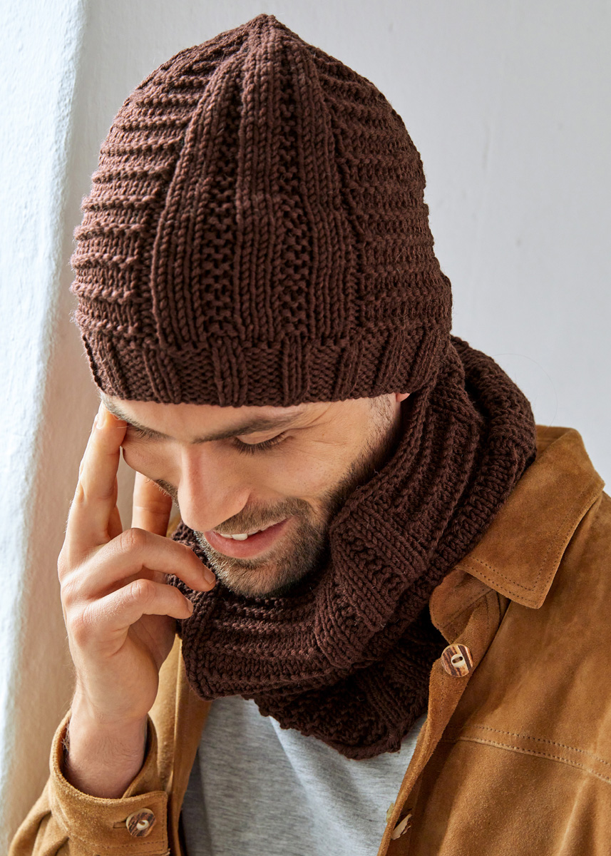 Lana Grossa-Qualität „Bingo“ (100% Schurwolle, LL = ca. 80 m/50 g); ca. 100 g Dunkelbraun (Fb 731); ein Nadelspiel Nr. 5–5,5